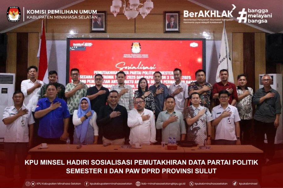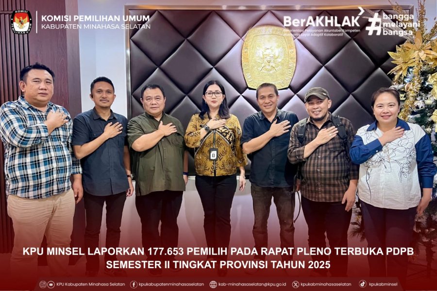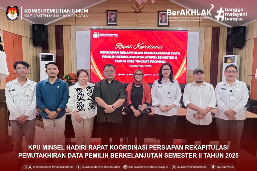 Manado - Komisi Pemilihan Umum (KPU) Kabupaten Minahasa Selatan menghadiri Rapat Koordinasi Persiapan Rekapitulasi Pemutakhiran Data Pemilih Berkelanjutan (PDPB) Semester II Tahun 2025 yang diselenggarakan oleh KPU Provinsi Sulawesi Utara. Kegiatan berlangsung di Aula Kantor KPU Provinsi. Kamis (11/12) Rapat koordinasi tersebut dihadiri oleh Ketua dan Anggota KPU Se-Sulawesi Utara, Kabag Perencanaan Data dan Informasi Provinsi Sulawesi Utara, Sekretaris KPU Se-Sulawesi Utara, Kasubbag Perencanaan Data dan Informasi Se-Sulawesi Utara, dan Admin/Operator Sidalih Se-Sulawesi Utara, serta perwakilan Bawaslu Provinsi Sulawesi Utara sebagai unsur pengawas. Ketua KPU Provinsi Sulawesi Utara, Kenly Poluan, membuka kegiatan dengan menegaskan pentingnya memperkuat koordinasi antarlembaga penyelenggara pemilu guna menjaga integritas data pemilih. “Pemutakhiran data pemilih yang dilakukan secara periodik merupakan wujud keseriusan kita dalam memastikan kualitas penyelenggaraan pemilu. Integrasi data kependudukan ke dalam sistem, terutama melalui aplikasi Sidalih, menjadi dasar bagi tersajinya data pemilih yang akurat, mutakhir, dan dapat dipertanggungjawabkan,” ujar Kenly. Dalam kesempatan tersebut, KPU Provinsi Sulawesi Utara memaparkan sejumlah hal teknis terkait finalisasi rekapitulasi semester II, peningkatan kualitas input data oleh operator Sidalih, serta penegasan pentingnya sinkronisasi data pemilih dengan data temuan dari Bawaslu. KPU Minsel melalui Divisi Data dan Informasi turut memberikan tanggapan serta laporan perkembangan pemutakhiran data selama semester berjalan. Berbagai isu teknis seperti potensi data Invalid, pemilih TMS, serta validasi perpindahan domisili pemilih menjadi fokus pembahasan. Melalui rapat ini, KPU Minsel menegaskan kembali komitmennya untuk menyajikan data pemilih yang akurat, bersih, dan dapat dipertanggungjawabkan, sebagai bagian dari dukungan terhadap penyelenggaraan pemilu yang profesional, transparan, dan berintegritas. Kegiatan ditutup dengan penyampaian arahan teknis lanjutan dari KPU Provinsi terkait finalisasi rekapitulasi semester II dan Persiapan Rapat Pleno Terbuka Pemutakhiran Data Pemilih Berkelanjutan Semester II Tahun 2025 tingkat Provinsi.