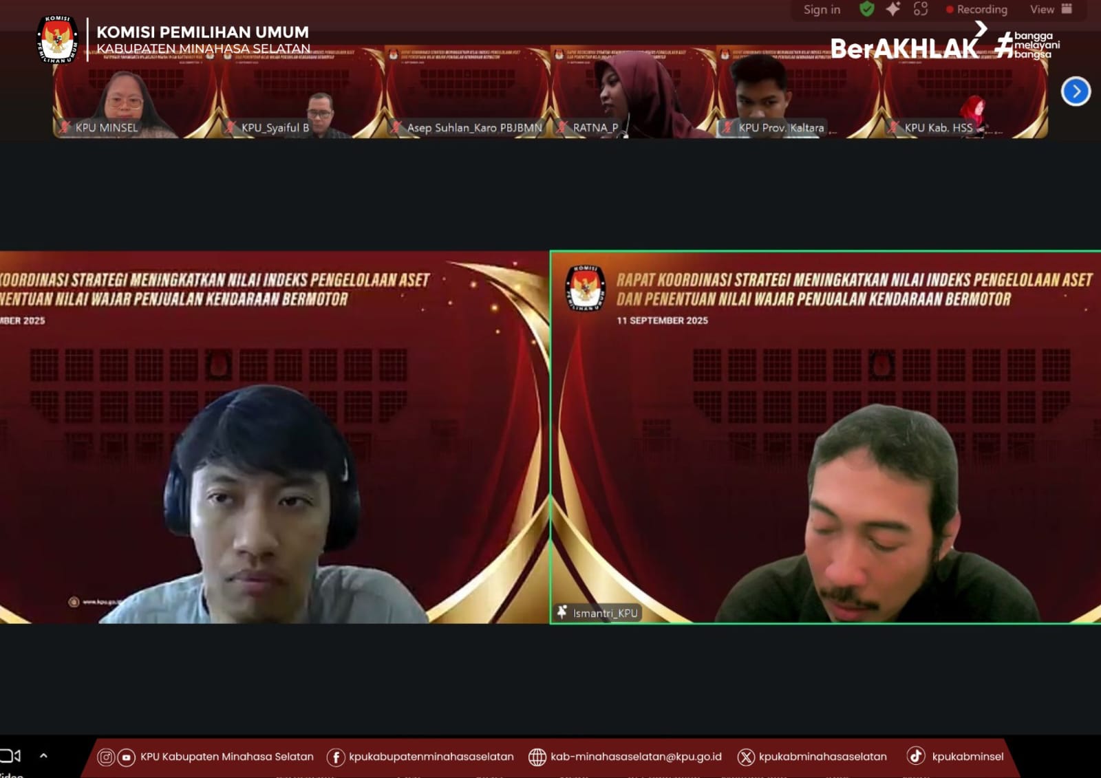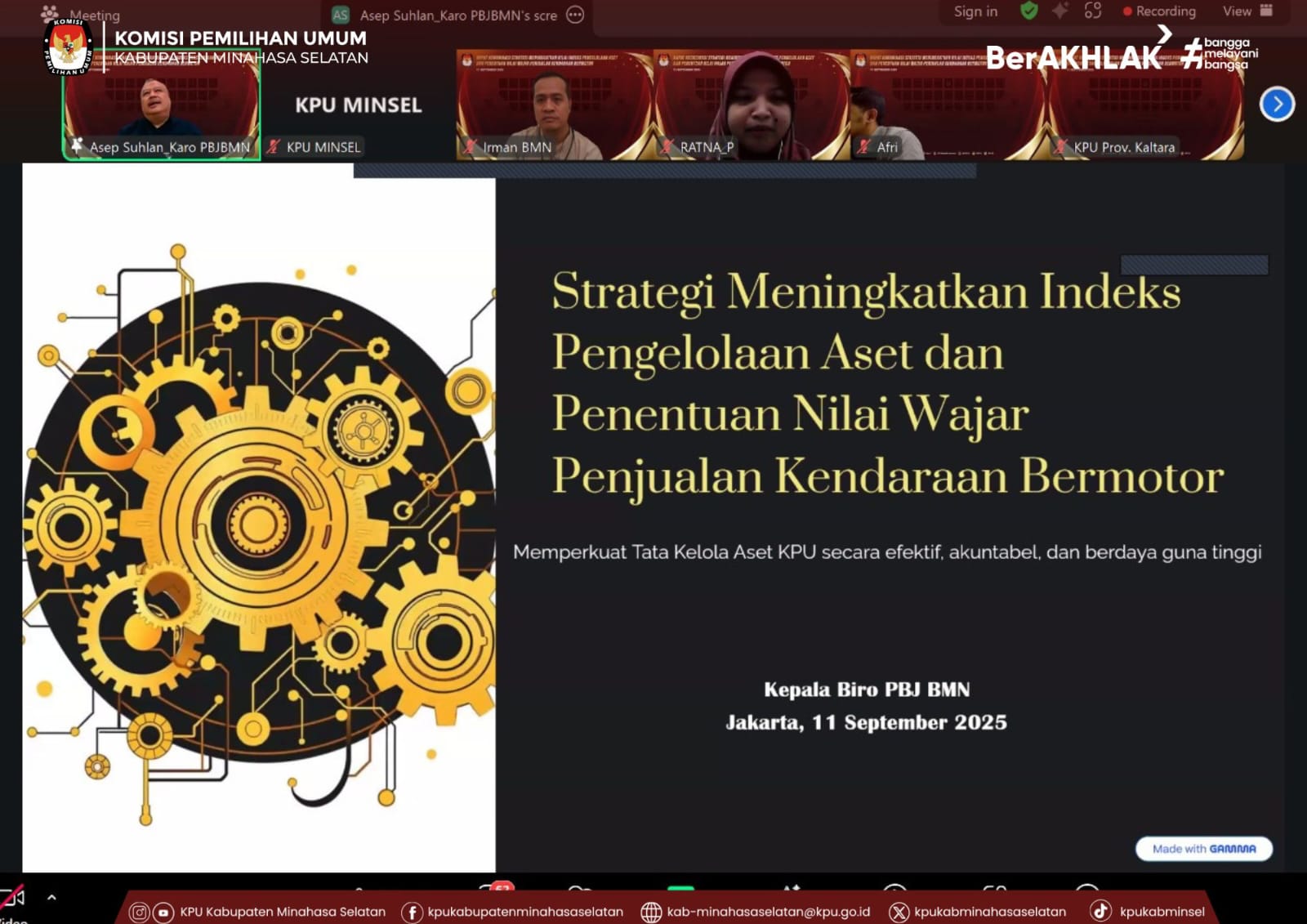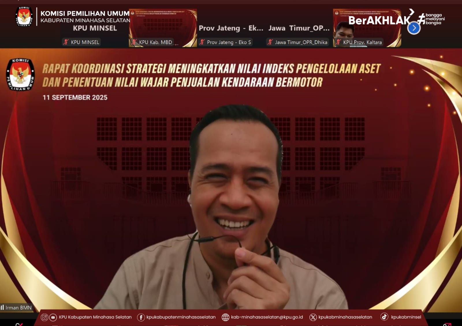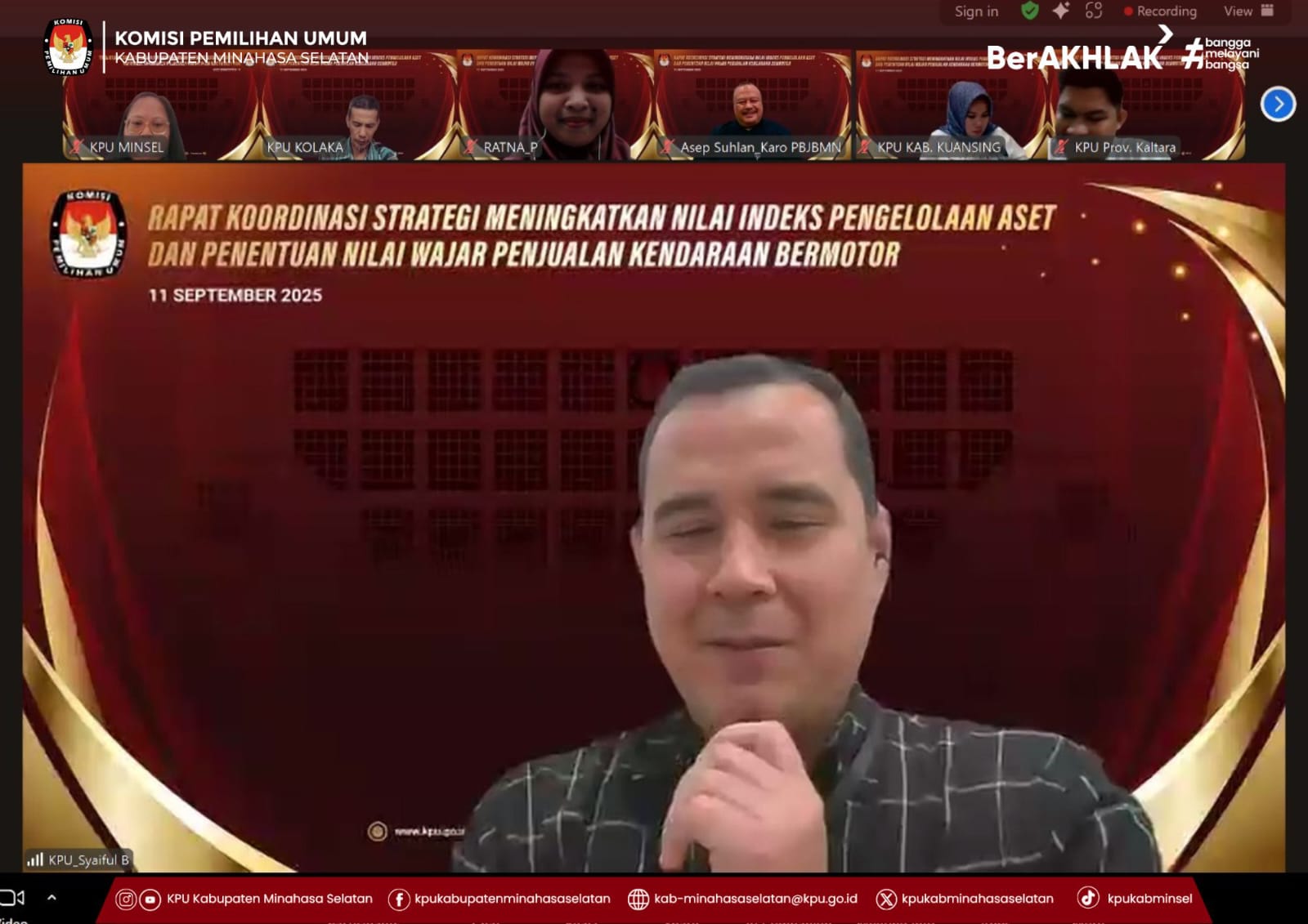 Amurang, 11 September 2025 - Komisi Pemilihan Umum (KPU) Kabupaten Minahasa Selatan terus memperkuat tata kelola aset negara dengan mengikuti Rapat Koordinasi Strategi Meningkatkan Nilai Indeks Pengelolaan Aset dan Penentuan Nilai Wajar Penjualan Kendaraan Bermotor yang digelar secara daring oleh KPU Republik Indonesia.