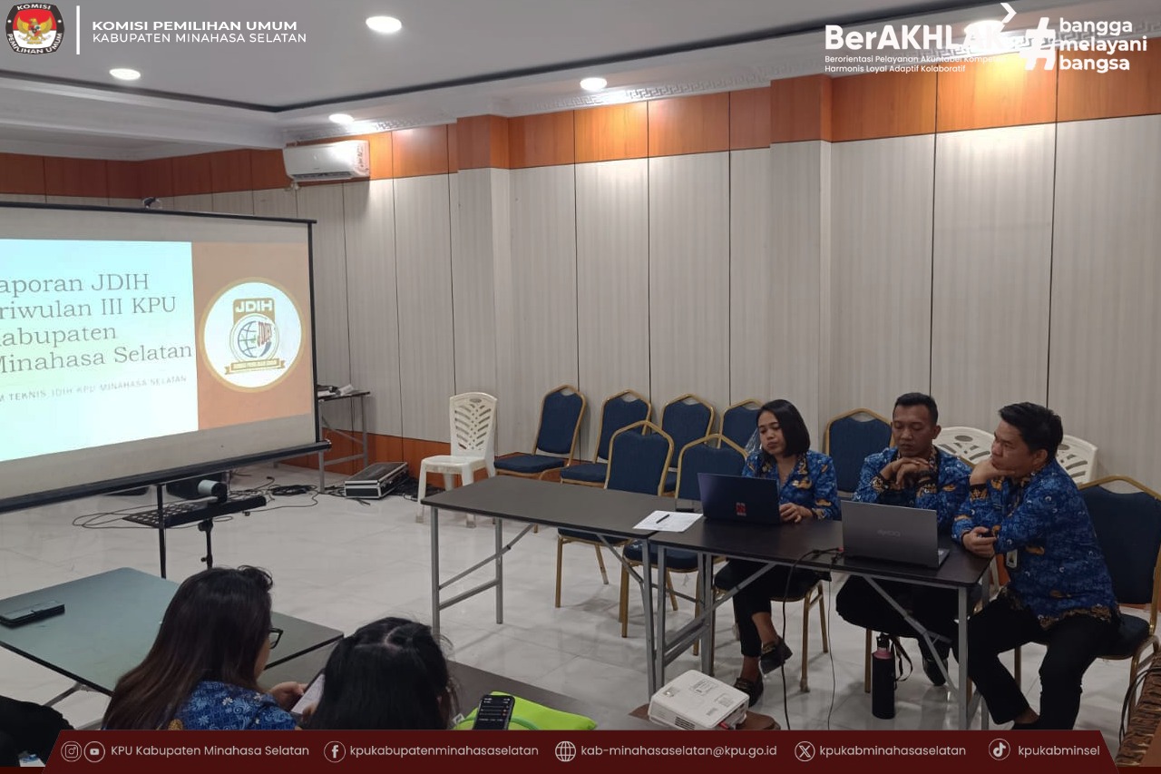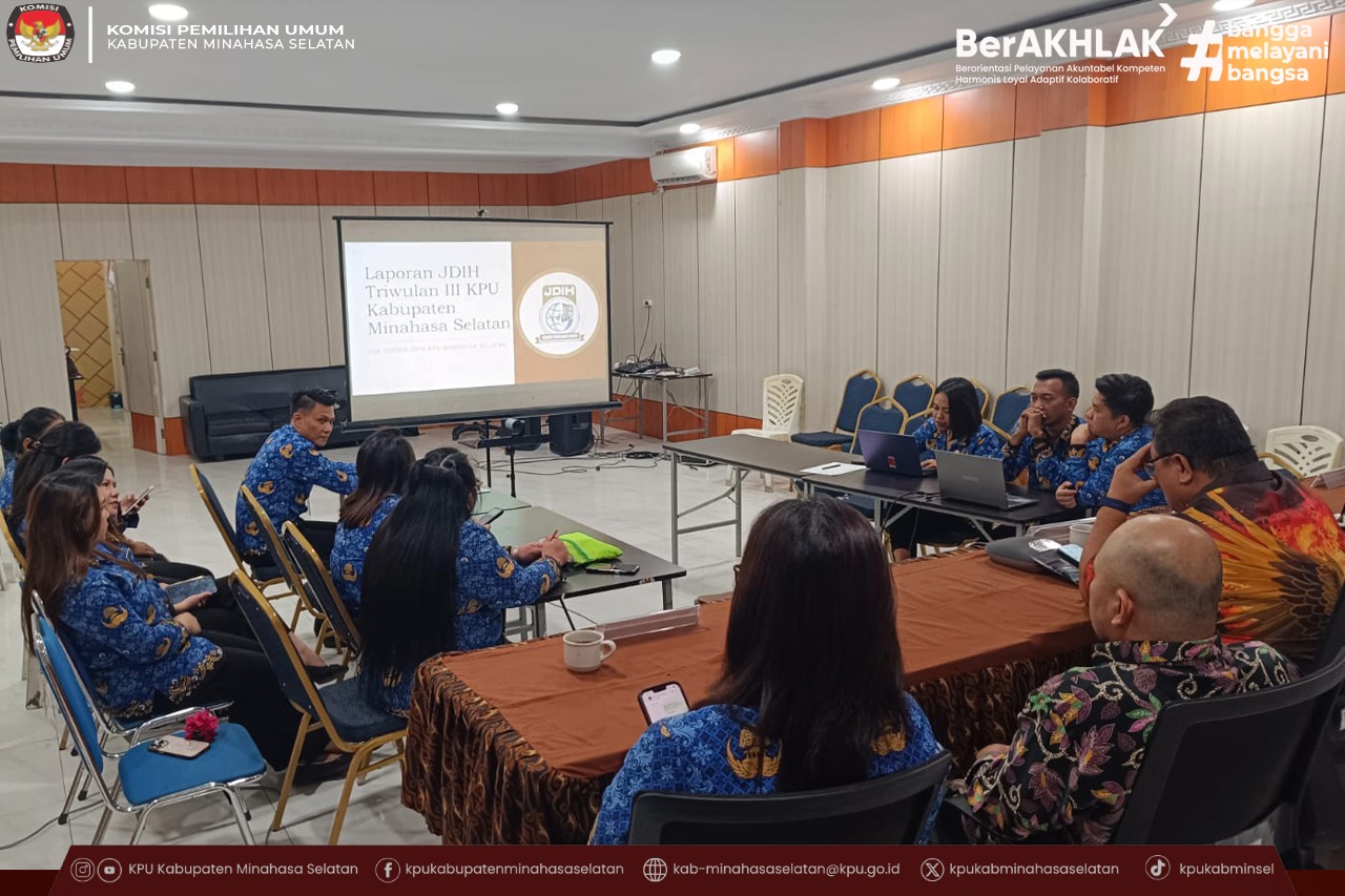 Amurang, 1 Oktober 2025 – Komisi Pemilihan Umum (KPU) Kabupaten Minahasa Selatan (Minsel) melaksanakan kegiatan evaluasi Jaringan Dokumentasi dan Informasi Hukum (JDIH) bulan Juli - September 2025 yang dihadiri oleh Tim Pembina dan Tim Teknis JDIH.