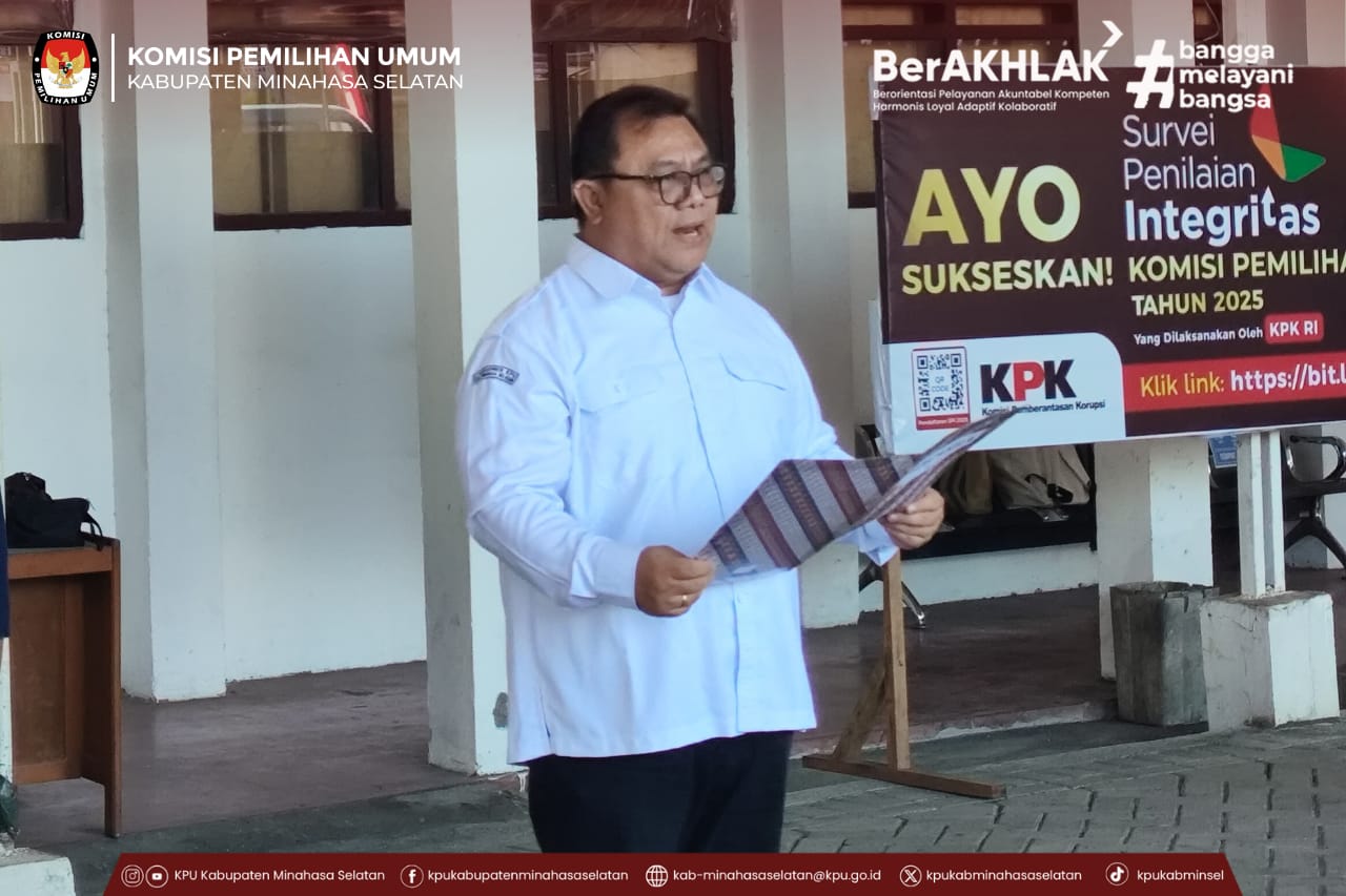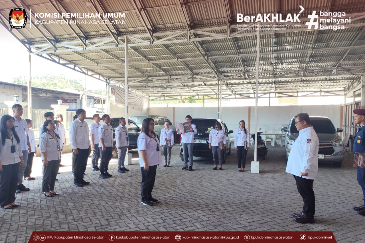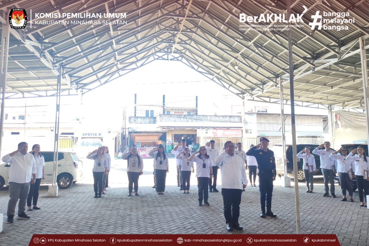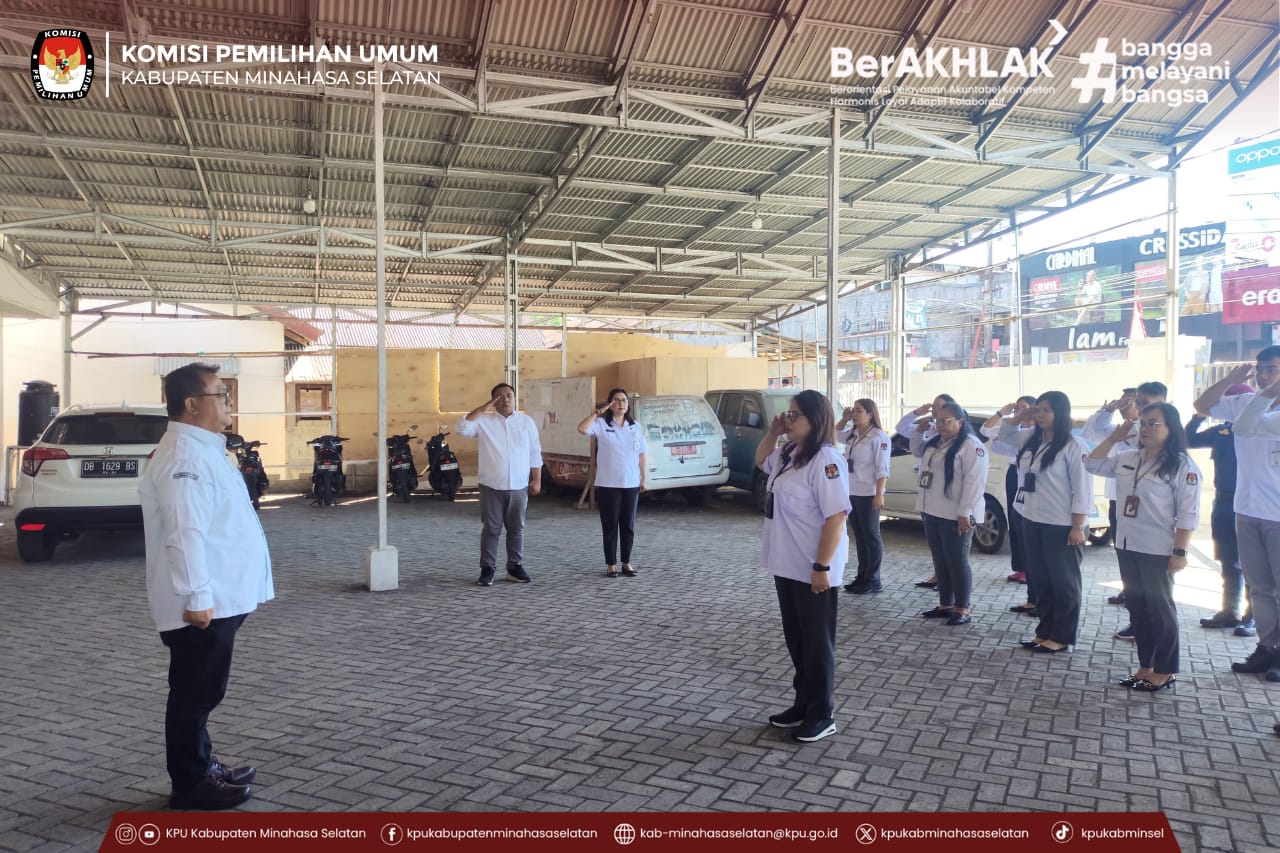 Amurang, 13 Oktober 2025 – Komisi Pemilihan Umum (KPU) Kabupaten Minahasa Selatan (Minsel) kembali menggelar Apel Pagi rutin hari ini, Senin (13/10), sebagai sarana penguatan disiplin dan etos kerja jajaran sekretariat. Apel yang berlangsung khidmat di halaman Kantor KPU Minsel ini dipimpin langsung oleh Ketua KPU Minsel, Tomy Moga, sebagai Pembina Apel, dengan Kasubbag Hukum dan SDM, Juwita Rosari Kasenda, sebagai Pemimpin Apel.