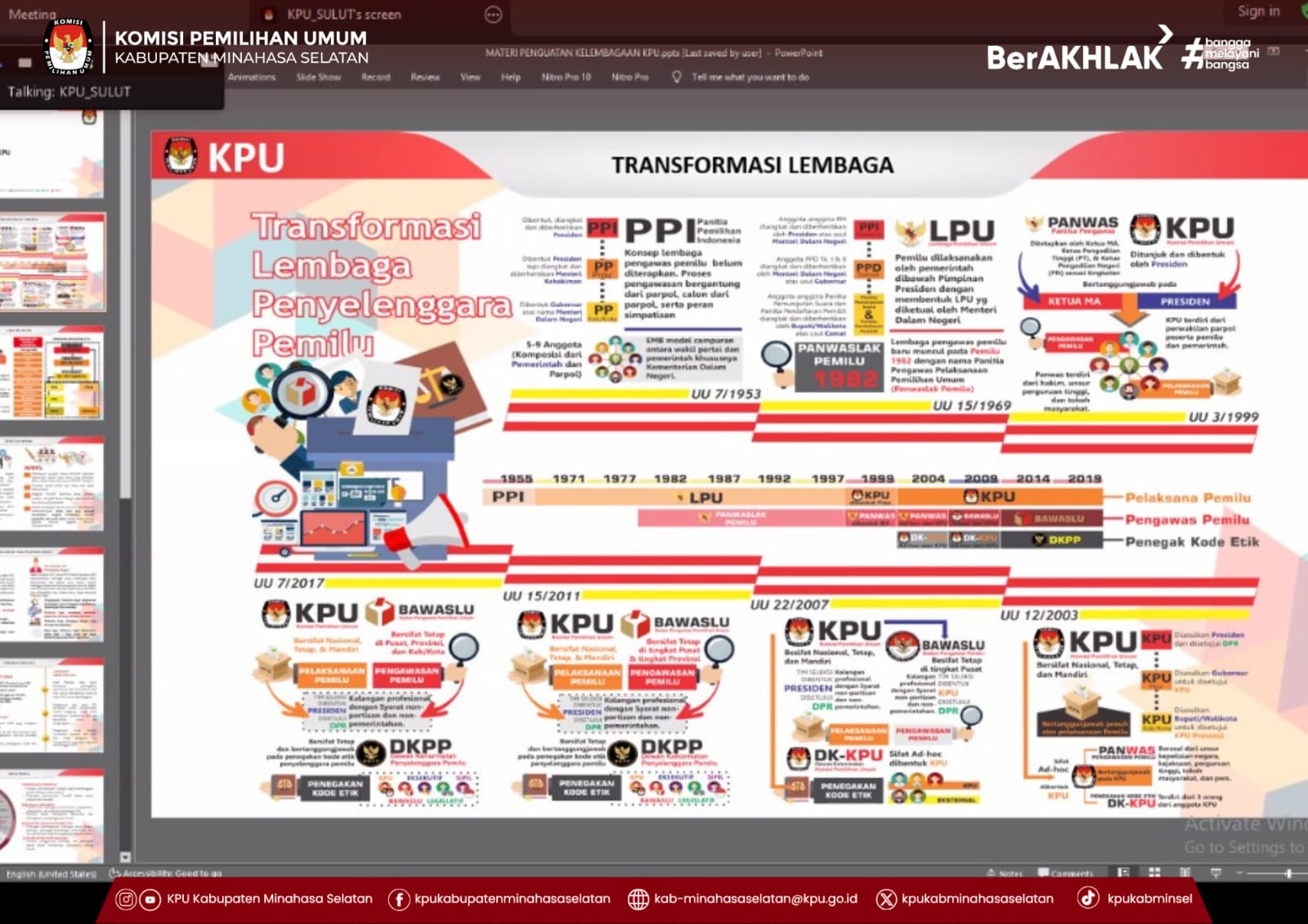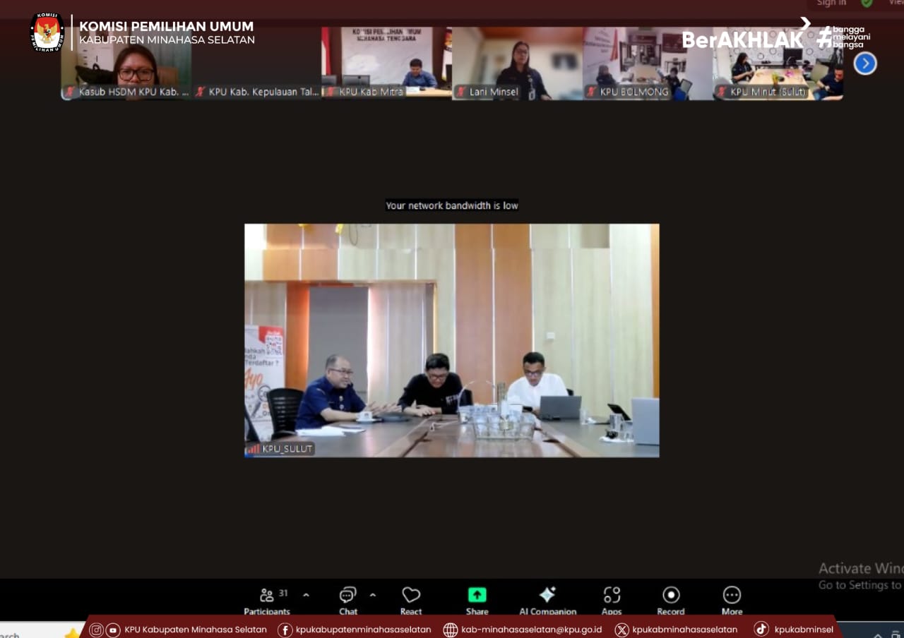 AMURANG, 14 Oktober 2025 – Tak ingin tertinggal dalam arus perubahan dan tuntutan transparansi, Komisi Pemilihan Umum (KPU) Kabupaten Minahasa Selatan (Minsel) berpartisipasi aktif dalam Rapat Koordinasi (Rakor) Penguatan Kapasitas Sumber Daya Manusia (SDM) dan Kelembagaan. Rakor yang digelar KPU Provinsi Sulawesi Utara (Sulut) secara daring pada Selasa (14/10/2025) ini menjadi ajang "isi ulang" energi dan strategi bagi jajaran penyelenggara pemilu di Nyiur Melambai.