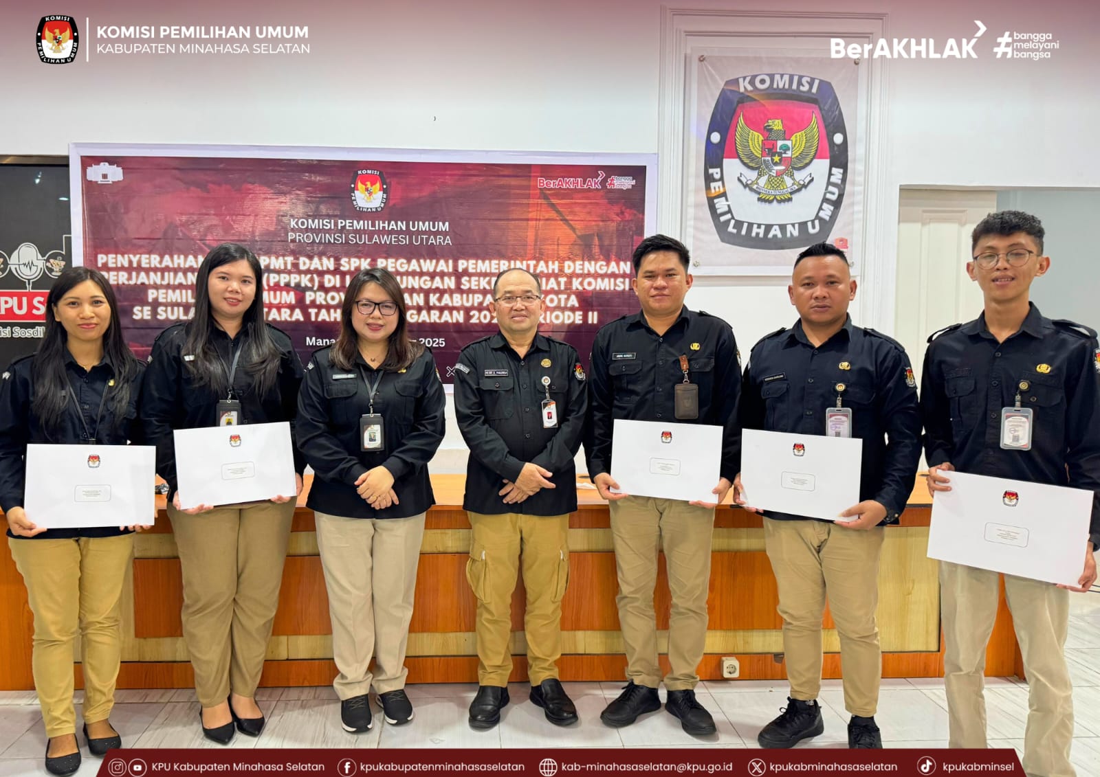 Manado, 15 Oktober 2025 - Sebanyak enam Pegawai Pemerintah dengan Perjanjian Kerja (PPPK) Tahap II Tahun 2024 dari Sekretariat KPU Kabupaten Minahasa Selatan menghadiri kegiatan penyerahan dokumen di Kantor KPU Provinsi Sulawesi Utara.