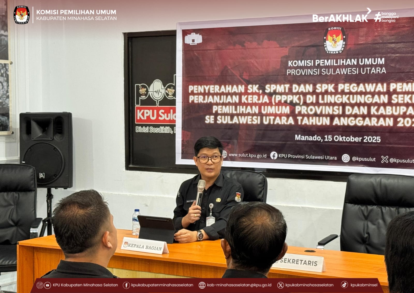 Acara ini merupakan penyerahan Petikan Keputusan Sekretaris Jenderal KPU Nomor 2116 Tahun 2025, Surat Pernyataan Melaksanakan Tugas (SPMT), dan Perjanjian Kerja kepada para PPPK KPU Provinsi dan KPU Kabupaten/Kota se-Sulawesi Utara.