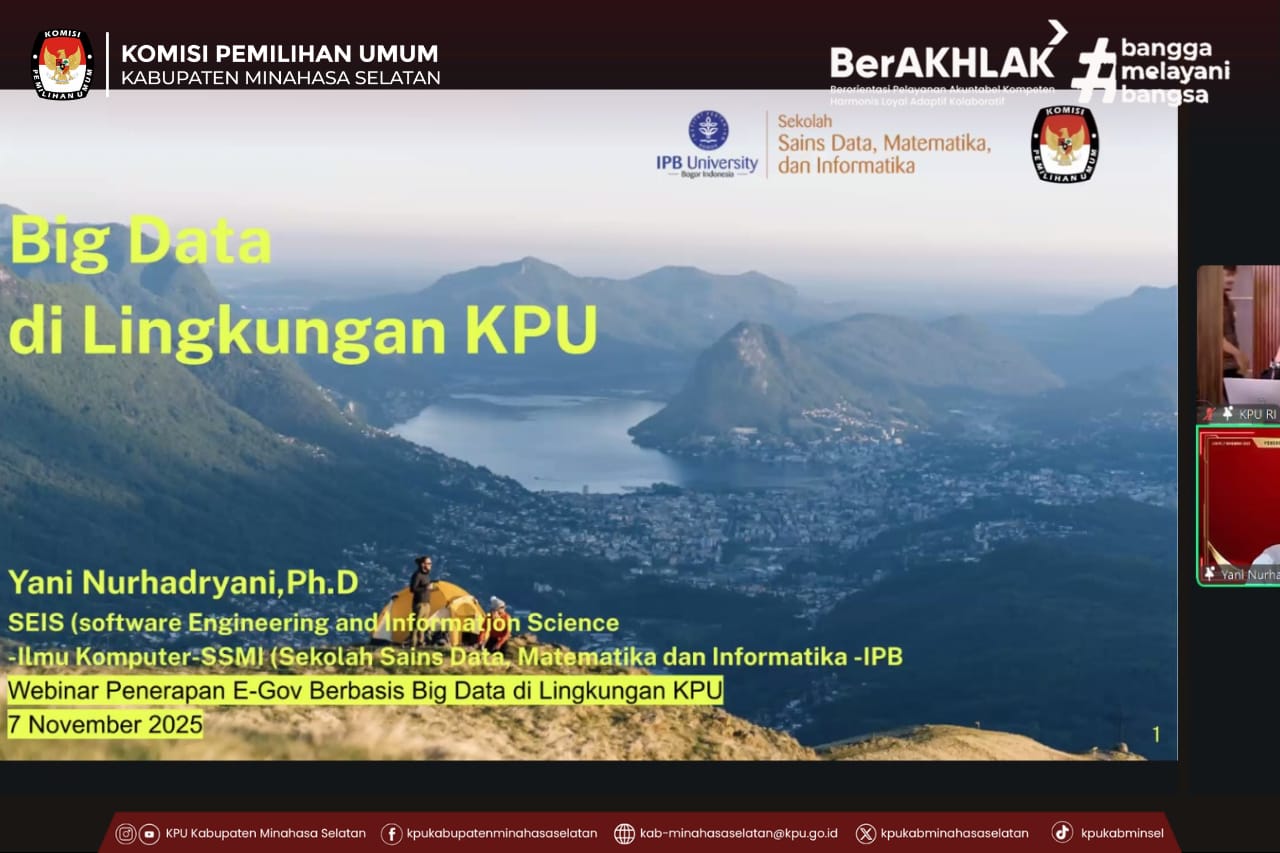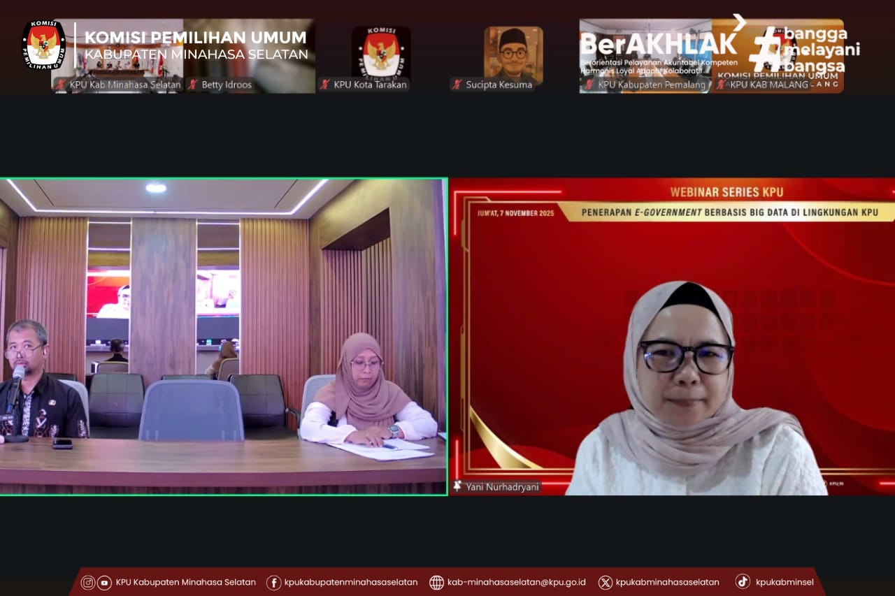 Amurang– Komisi Pemilihan Umum (KPU) Kabupaten Minahasa Selatan mengikuti Webinar Series bertajuk “Penerapan E-Government Berbasis Big Data di Lingkungan KPU” yang diselenggarakan oleh KPU Republik Indonesia secara daring melalui aplikasi Zoom Meeting, Jumat (7/11/2025).