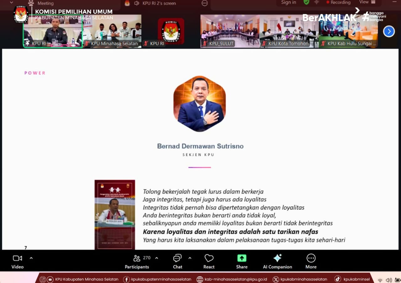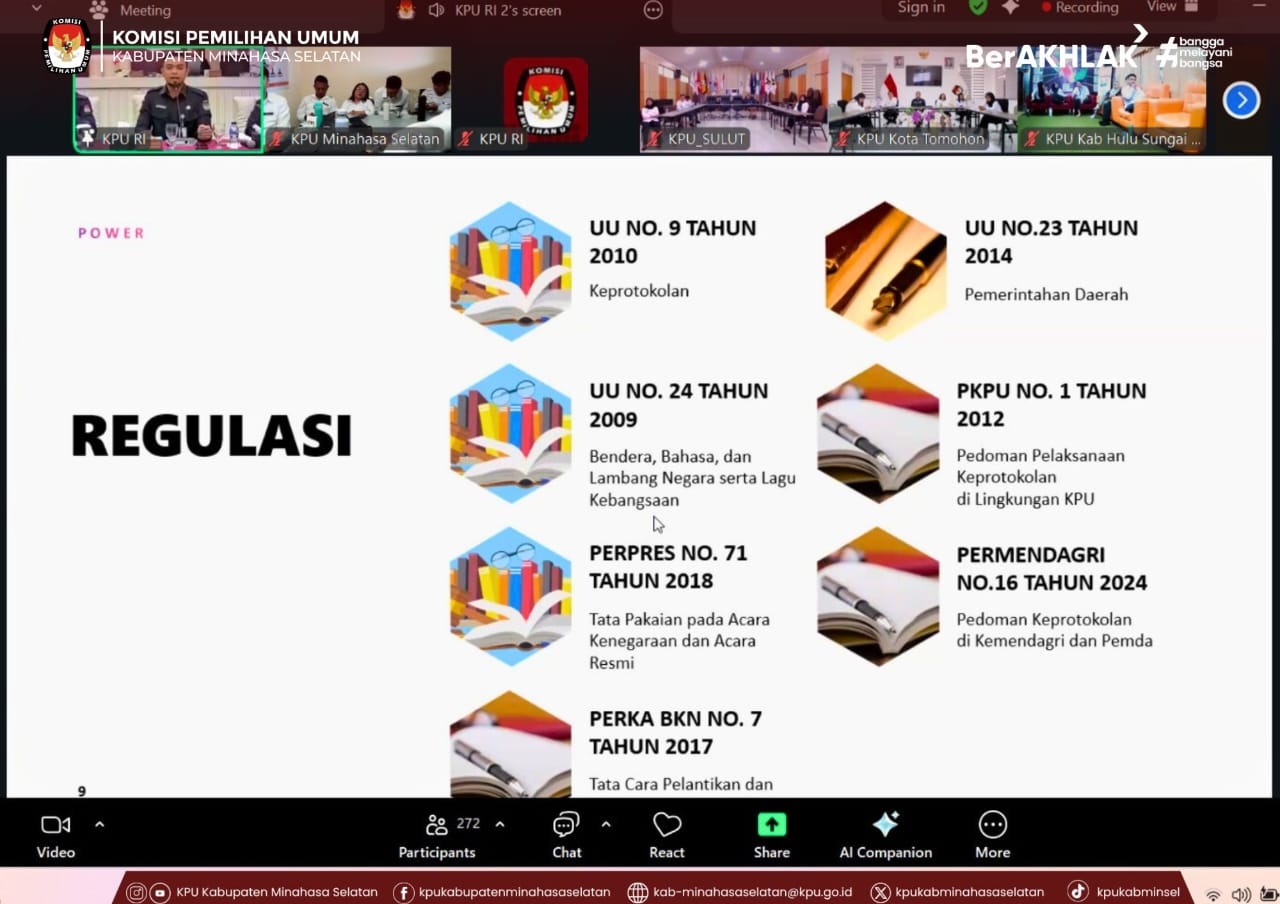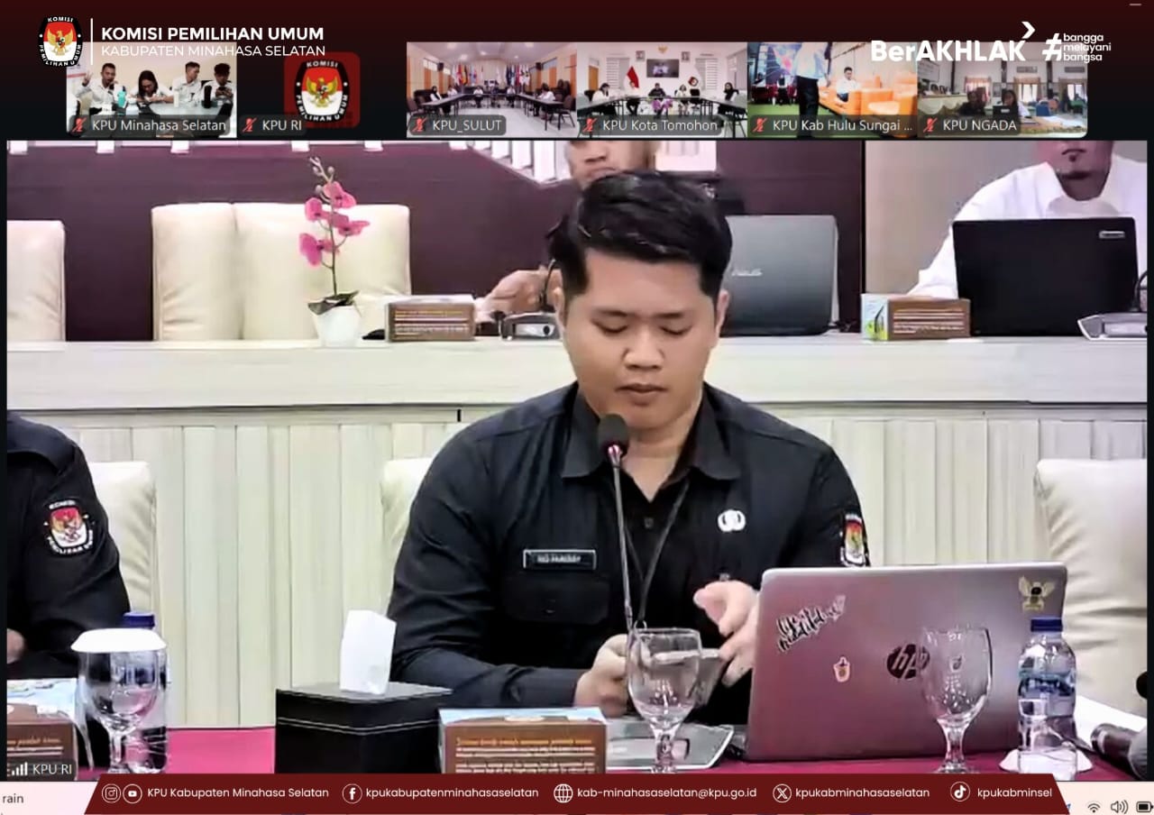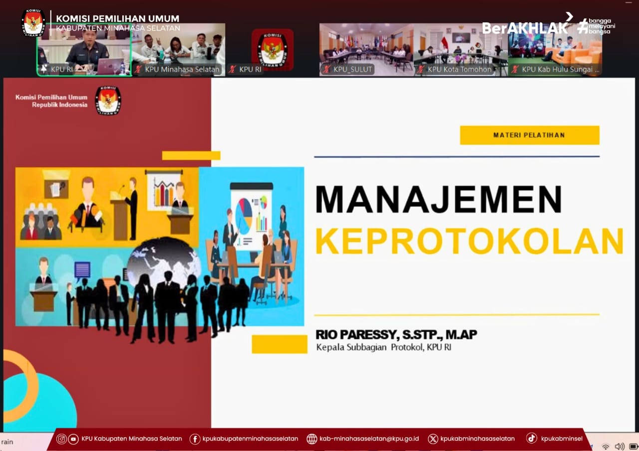 Amurang, 11 November 2025 — Komisi Pemilihan Umum (KPU) Kabupaten Minahasa Selatan mengikuti kegiatan Bimbingan Teknis (Bimtek) Keprotokolan yang diselenggarakan oleh Sekretariat Jenderal KPU Republik Indonesia secara daring melalui platform virtual meeting.