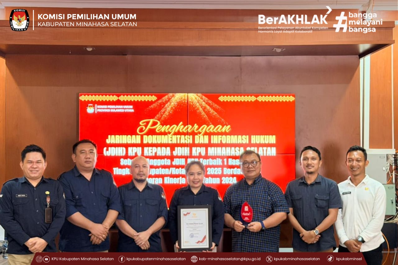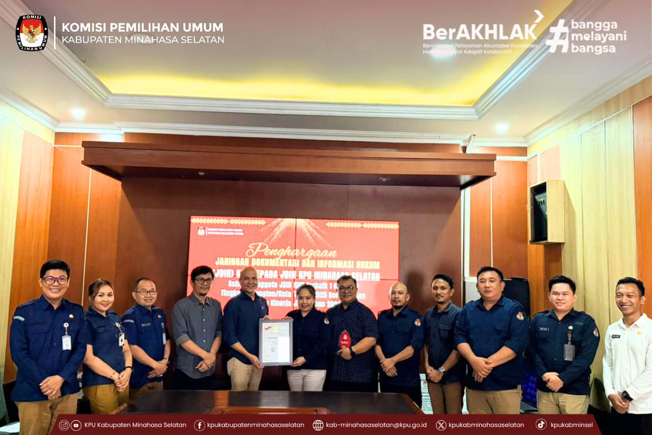 Amurang, 25 November 2025 — Komisi Pemilihan Umum (KPU) Kabupaten Minahasa Selatan (Minsel) resmi menerima Penghargaan Jaringan Dokumentasi dan Informasi Hukum (JDIH) sebagai Anggota JDIH KPU Terbaik 1 Nasional Tingkat Kabupaten/Kota Tahun 2025, berdasarkan laporan kinerja JDIH tahun 2024.