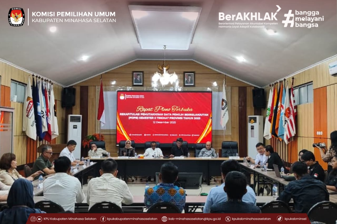 Amurang – Komisi Pemilihan Umum (KPU) Kabupaten Minahasa Selatan menghadiri Rapat Pleno Terbuka Pemutakhiran Data Pemilih Berkelanjutan (PDPB) Semester II Tahun 2025 tingkat Provinsi Sulawesi Utara yang diselenggarakan oleh KPU Provinsi Sulawesi Utara, bertempat di Aula Kantor KPU Provinsi, Jumat (12/12).
