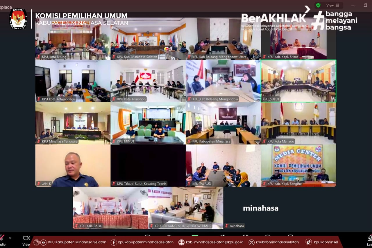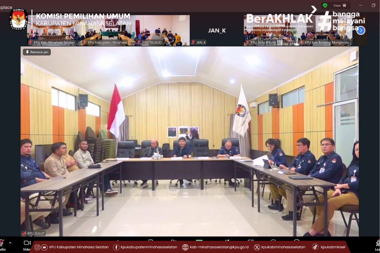 Ketua dan Anggota KPU Kabupaten Minahasa Selatan bersama jajaran pejabat manajerial mengikuti Rapat Kerja Penguatan Kelembagaan dan Perencanaan Kinerja Tahun Anggaran 2026 yang diselenggarakan KPU Provinsi Sulawesi Utara secara daring, Selasa (20/1/2026).