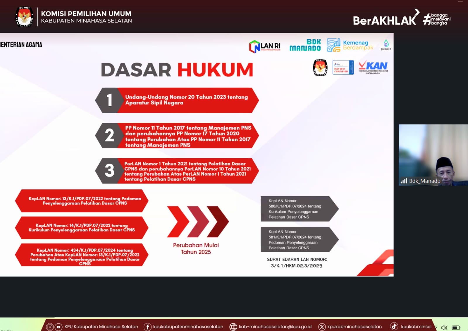 Amurang - Kamis, 19 Februari 2026, Komisi Pemilihan Umum Kabupaten Minahasa Selatan mengikuti kegiatan Sosialisasi Pelaksanaan Pelatihan Dasar (Latsar) CPNS Tahun 2026 yang diselenggarakan oleh Balai Diklat Keagamaan Manado.