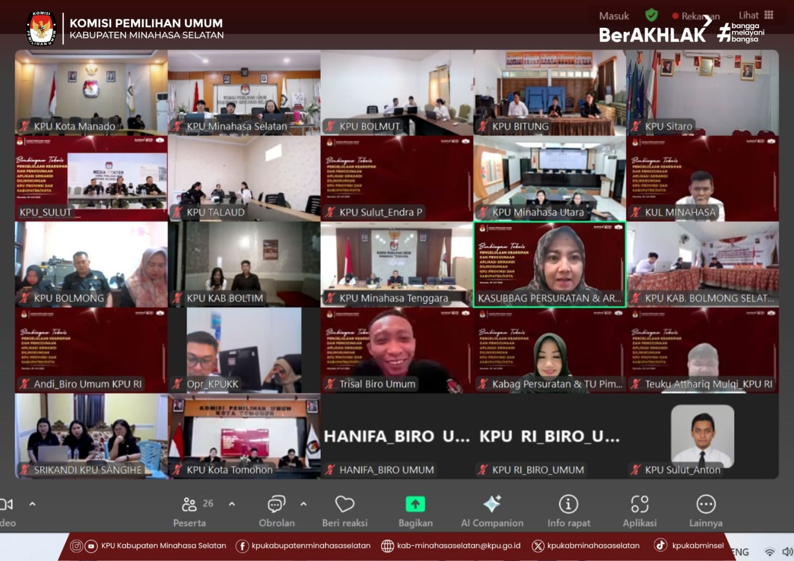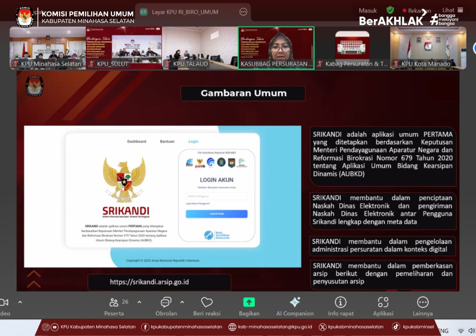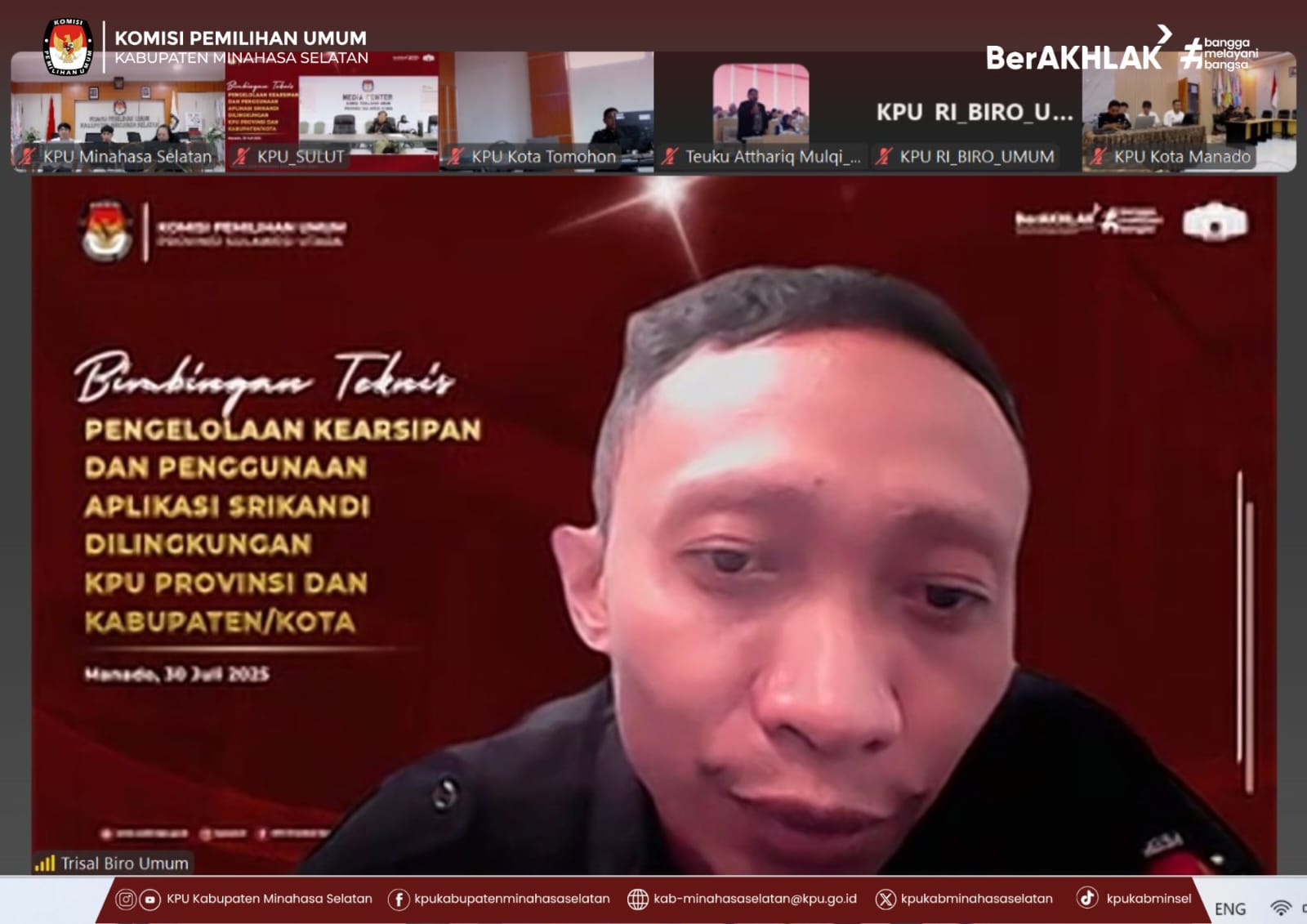 Amurang, 30 Juli 2025 — Komisi Pemilihan Umum (KPU) Kabupaten Minahasa Selatan mengikuti kegiatan Bimbingan Teknis (Bimtek) Pengelolaan Kearsipan dan Pemanfaatan Aplikasi SRIKANDI (Sistem Informasi Kearsipan Dinamis Terintegrasi) yang diselenggarakan secara daring oleh KPU Provinsi Sulawesi Utara.