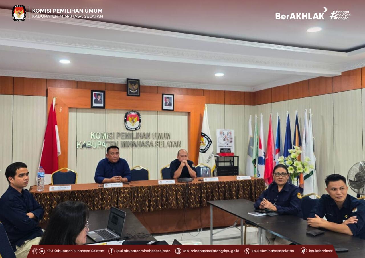 Amurang, 15 Juli 2025 — Komisi Pemilihan Umum (KPU) Kabupaten Minahasa Selatan mengikuti Rapat Koordinasi (Rakor) bersama KPU Provinsi Sulawesi Utara dalam rangka menindaklanjuti Surat Sekretaris Jenderal KPU Nomor 2302/PW.02-SD/12/2025 tanggal 11 Juli 2025, perihal Pemberitahuan Pemeriksaan Pendahuluan dengan Tujuan Tertentu atas Pengelolaan Belanja Pemilihan Kepala Daerah Serentak Tahun 2024, serta Penataan Sarana dan Prasarana dan Sumber Daya Manusia (SDM).