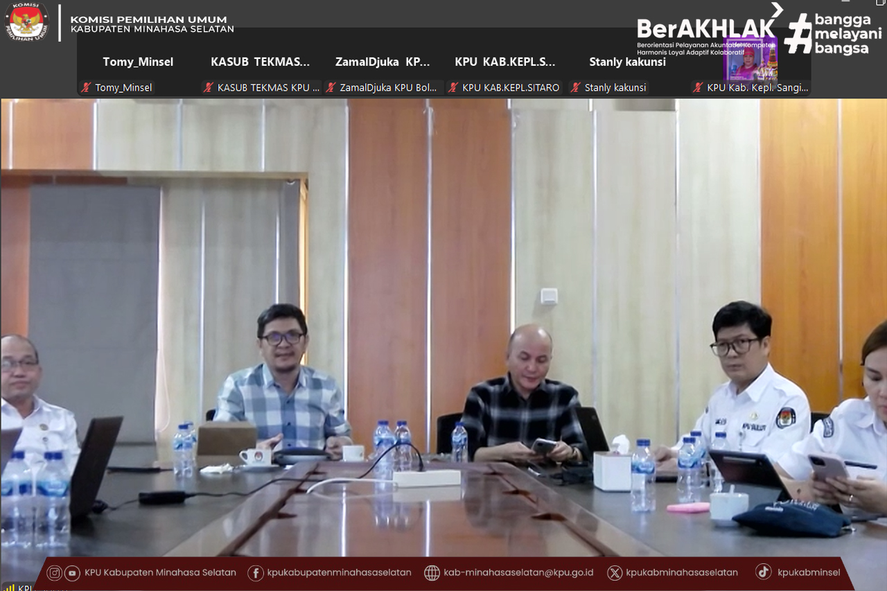 Amurang, 7 Agustus 2025 – Komisi Pemilihan Umum (KPU) Kabupaten Minahasa Selatan mengikuti kegiatan Rapat Koordinasi Evaluasi Pelaporan Kartu Kendali Triwulan I dan Monitoring Pelaksanaan Penilaian Maturitas SPIP Tahun 2025, yang diselenggarakan oleh KPU Provinsi Sulawesi Utara secara daring pada Kamis (7/8).