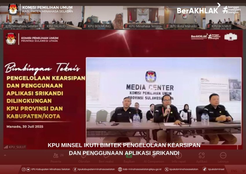 Amurang, 30 Juli 2025 — Komisi Pemilihan Umum (KPU) Kabupaten Minahasa Selatan mengikuti kegiatan Bimbingan Teknis (Bimtek) Pengelolaan Kearsipan dan Pemanfaatan Aplikasi SRIKANDI (Sistem Informasi Kearsipan Dinamis Terintegrasi) yang diselenggarakan secara daring oleh KPU Provinsi Sulawesi Utara. Kegiatan ini diikuti oleh seluruh satuan kerja KPU se-Sulawesi Utara, baik di tingkat provinsi maupun kabupaten/kota. Bimtek dibuka secara resmi oleh Kepala Bagian Persuratan dan Tata Usaha KPU Republik Indonesia, yang dalam arahannya menekankan pentingnya peran aktif seluruh satuan kerja dalam mendukung penerapan Aplikasi SRIKANDI secara optimal, sebagai bagian dari reformasi birokrasi dan digitalisasi kearsipan di lingkungan KPU. Adapun materi yang disampaikan dalam bimtek meliputi: • Pengelolaan struktur organisasi dalam aplikasi, • Pengiriman dan penerimaan surat elektronik secara digital, • Penataan dan pelacakan arsip dinamis secara terintegrasi. Tujuan utama dari kegiatan ini adalah untuk mendorong terwujudnya pengelolaan arsip yang tertib, efisien, transparan, dan akuntabel dengan memanfaatkan teknologi informasi, guna mendukung tata kelola kelembagaan yang modern dan profesional. KPU Kabupaten Minahasa Selatan menyambut baik kegiatan ini dan menyatakan komitmen penuh dalam mengimplementasikan materi yang diperoleh, termasuk melalui pelibatan Kepala Subbagian Keuangan, Umum, dan Logistik serta para operator Aplikasi SRIKANDI. “Dengan bimtek ini, kami berharap pengelolaan arsip di lingkungan KPU Minahasa Selatan dapat semakin tertata dan siap mendukung keterbukaan informasi publik secara profesional,” ujar salah satu peserta.