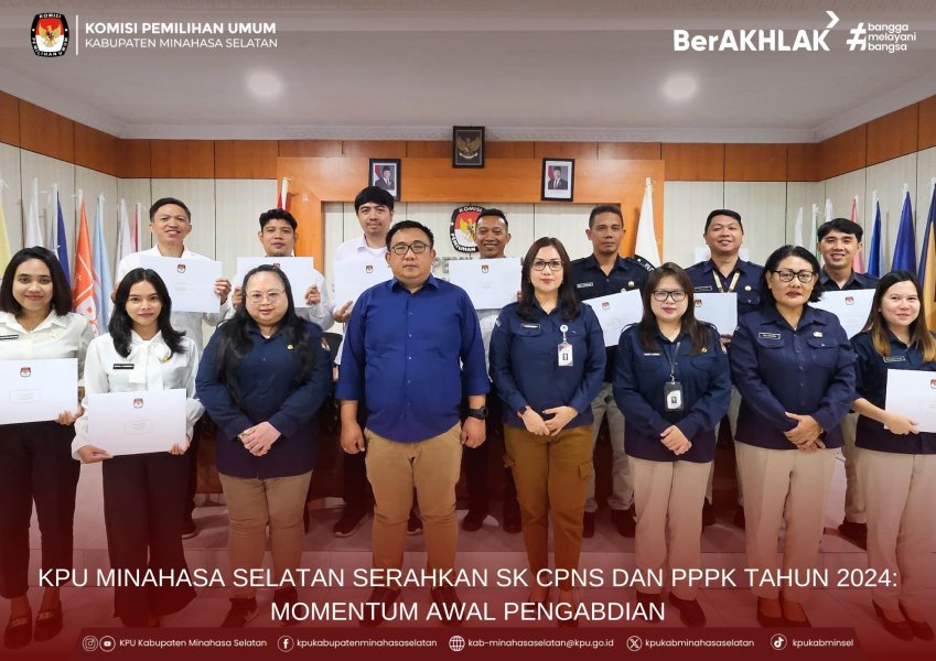 Amurang — Komisi Pemilihan Umum (KPU) Kabupaten Minahasa Selatan menggelar penyerahan Surat Keputusan Sekretaris Jenderal KPU tentang Pengangkatan Calon Pegawai Negeri Sipil (CPNS) Tahun Anggaran 2024 dan Pegawai Pemerintah dengan Perjanjian Kerja (PPPK) Tahun 2024, yang dilaksanakan di Aula KPU Kabupaten Minahasa Selatan, pada Selasa, 1 Juli 2025. Kegiatan ini dihadiri oleh Ketua Divisi Teknis Penyelenggaraan Pemilu KPU Minsel, Hanny Porajow, serta Sekretaris KPU Minsel, Lani L. A. Alou, bersama para pejabat struktural sekretariat KPU. Seluruh formasi yang menerima SK hadir lengkap, terdiri dari 6 orang CPNS dan 4 orang PPPK. Dalam arahannya, Hanny Porajow menyampaikan pentingnya menjunjung tinggi integritas dan profesionalisme sebagai bagian dari keluarga besar KPU. Hal senada disampaikan Sekretaris KPU, Lani Alou, yang menekankan pentingnya membangun komitmen, loyalitas, dan semangat kolaboratif dalam mendukung tugas kelembagaan. Kegiatan ini dipandu oleh Kasubbag Partisipasi, Hubungan Masyarakat, dan SDM, Rosari Kasenda, dan dilanjutkan dengan penyerahan SK secara simbolis kepada perwakilan CPNS dan PPPK, serta diakhiri dengan foto bersama seluruh peserta dan pimpinan. Penyerahan SK ini menandai langkah awal pengabdian bagi para ASN baru yang akan memperkuat tata kelola kelembagaan KPU Minahasa Selatan ke depan.