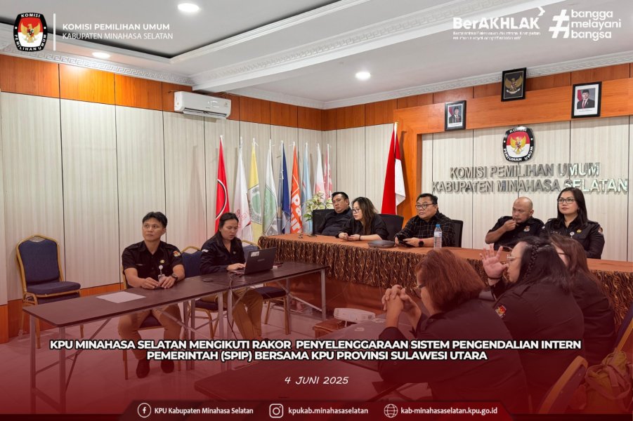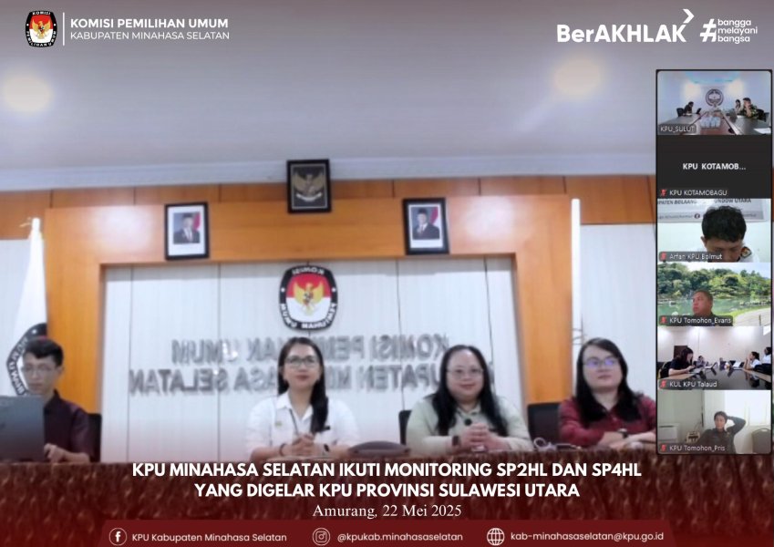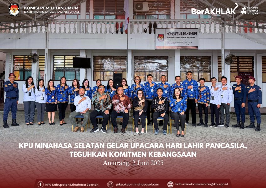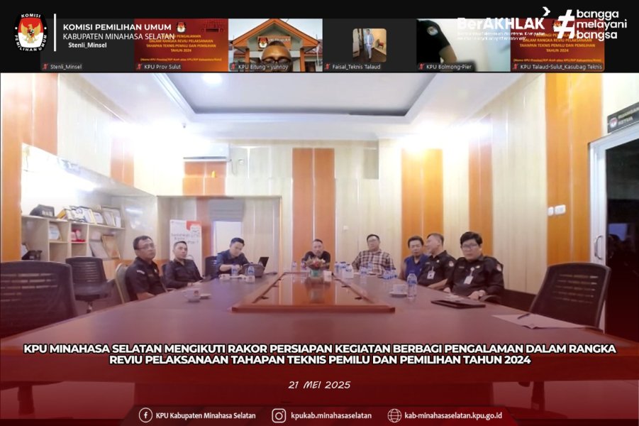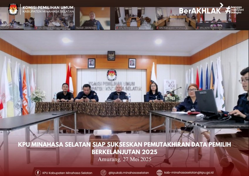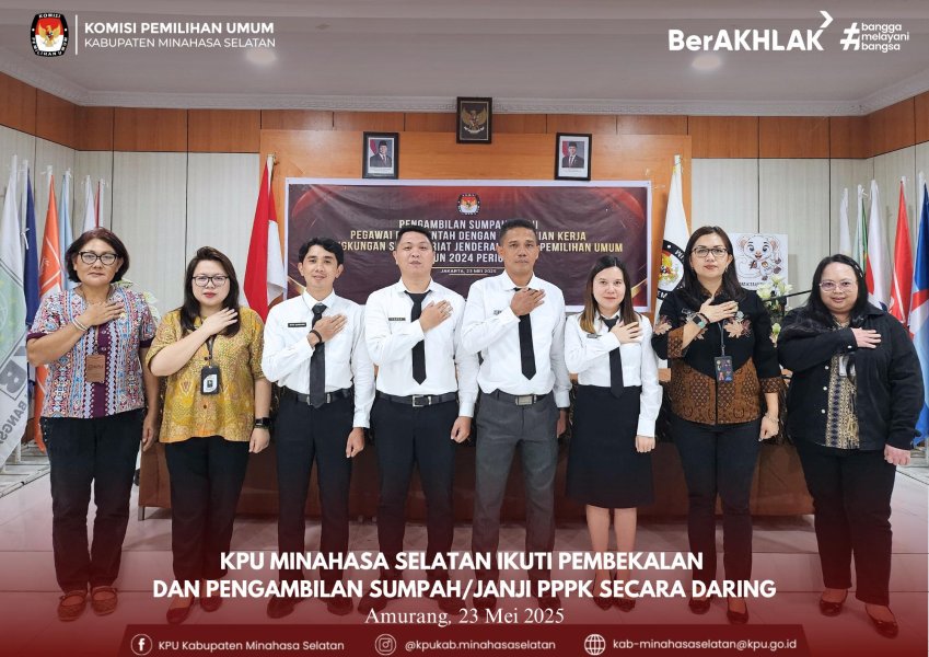 Amurang – Komisi Pemilihan Umum (KPU) Kabupaten Minahasa Selatan mengikuti kegiatan Pembekalan dan Pengambilan Sumpah/Janji Pegawai Pemerintah dengan Perjanjian Kerja (PPPK) di lingkungan Sekretariat Jenderal KPU Tahun 2024 Periode I, pada Jumat, 23 Mei 2025, yang dilaksanakan secara daring dari Aula KPU Kabupaten Minahasa Selatan.