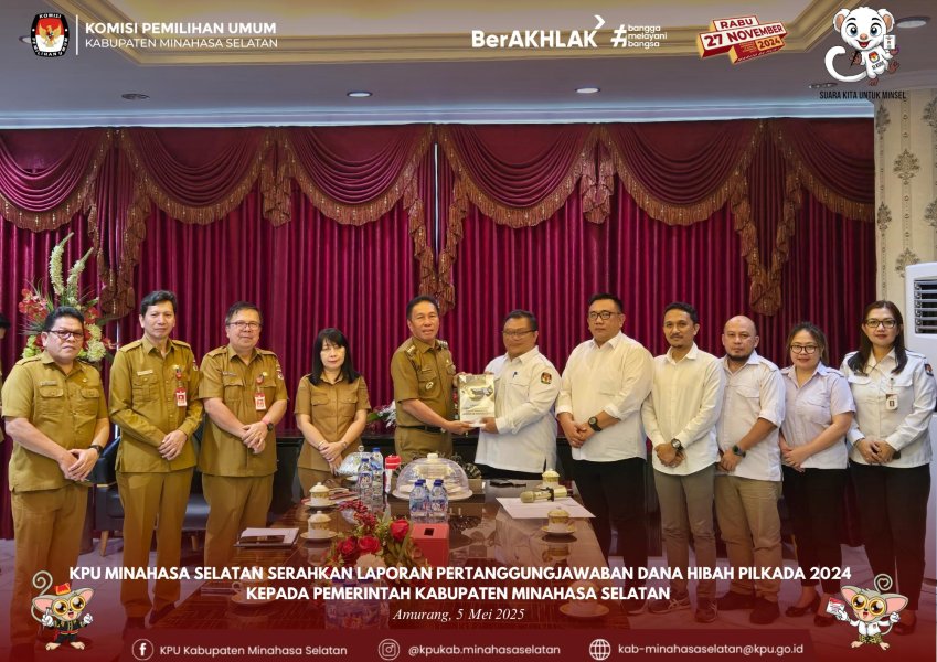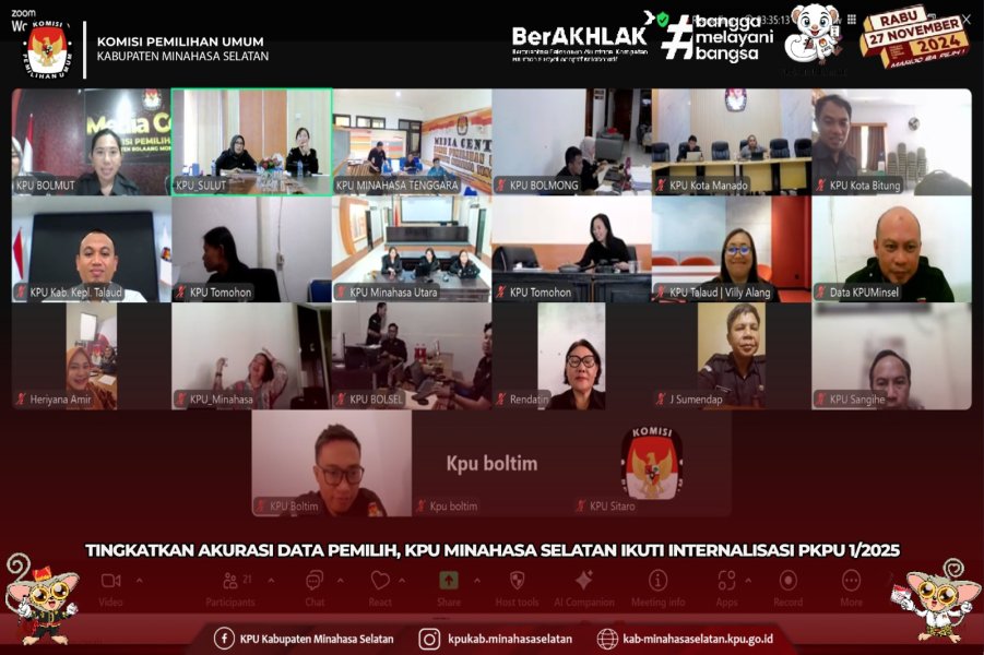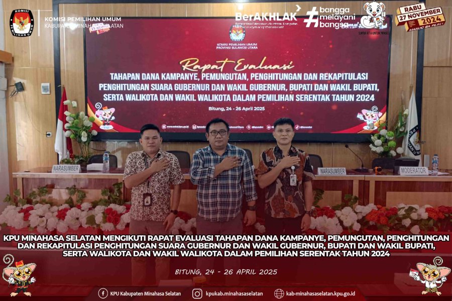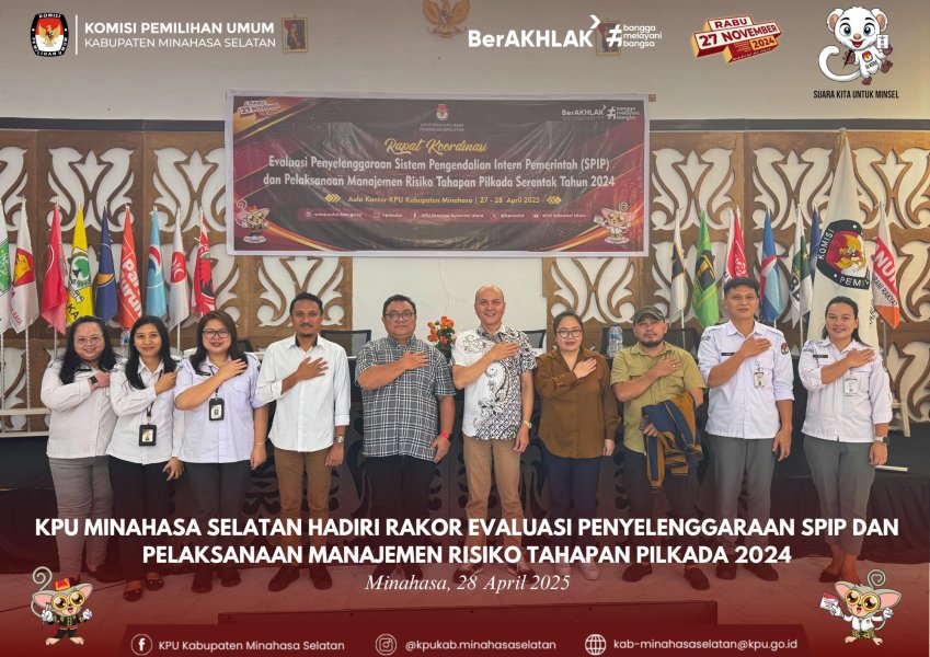 KPU Kab. Minahasa Selatan mengikuti Rapat Koordinasi Evaluasi Penyelenggaraan Sistem Pengendalian Intern Pemerintah (SPIP) dan Pelaksanaan Manajemen Risiko dalam rangka mendukung suksesnya tahapan Pemilihan Kepala Daerah (Pilkada) Serentak Tahun 2024 yang diselenggarakan oleh KPU Prov. Sulawesi utara, di Aula Kantor KPU Minahasa dan diikuti oleh jajaran KPU Kabupaten/Kota se-Sulawesi Utara, pada senin 28 April 2025. Dan untuk KPU Minahasa Selatan diikuti oleh Ketua dan Anggota, para kasubag dan operator SPIP.