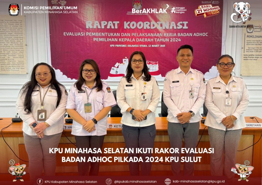 Manado, 14 Maret 2025 – Komisi Pemilihan Umum (KPU) Minahasa Selatan turut serta dalam Rapat Koordinasi Evaluasi Pembentukan dan Pelaksanaan Kerja Badan Adhoc Pemilihan Kepala Daerah Tahun 2024, yang berlangsung di Kantor KPU Provinsi Sulawesi Utara pada 13-14 Maret 2025. Kegiatan ini dibuka oleh Ketua KPU Provinsi Sulut, kemudian dilanjutkan dengan arahan dari para Komisioner KPU Sulut, yakni Meidy Tinangon dan Awaludin Umbola. Sebagai narasumber, hadir dalam kegiatan ini: 1. Ketua DKPP RI, Heddy Lugito 2. Akademisi, Dekan FISIP Universitas Sam Ratulangi (UNSRAT), Ferry Liando 3. Ketua Bawaslu Provinsi Sulut, Ardiles Mewoh Peserta dalam rakor ini terdiri dari Ketua Divisi Sosialisasi, Pendidikan Pemilih, Partisipasi Masyarakat & SDM, Sekretaris, serta para Kasubbag dari KPU kabupaten/kota se-Sulawesi Utara, termasuk dari KPU Minahasa Selatan. Rakor ini menjadi momentum penting dalam mengevaluasi kinerja badan adhoc yang telah bertugas dalam tahapan Pilkada 2024, sekaligus merumuskan langkah-langkah strategis guna meningkatkan efektivitas dan profesionalisme penyelenggara Pilkada mendatang. Dengan adanya evaluasi ini, diharapkan pelaksanaan pemilihan di masa mendatang dapat berjalan lebih baik, transparan, dan akuntabel, sesuai dengan prinsip demokrasi yang jujur dan adil.