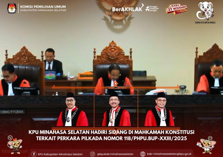 Jakarta – Komisi Pemilihan Umum (KPU) Kabupaten Minahasa Selatan menghadiri sidang Mahkamah Konstitusi (MK) pada Kamis, 23 Januari 2025, terkait Perkara Nomor 118/PHPU.BUP-XXIII/2025. Sidang yang berlangsung di Ruang Sidang Gedung 2 Lantai 4 ini dipimpin oleh Majelis Hakim yang terdiri dari Suhartoyo sebagai Ketua, serta Daniel Yusmic Pancastaki Foekh dan M. Guntur Hamzah sebagai anggota. Agenda sidang kali ini adalah mendengarkan jawaban Termohon, keterangan pihak terkait, keterangan Bawaslu, serta pengesahan alat bukti para pihak. KPU Minahasa Selatan diwakili oleh Anggota KPU Divisi Hukum dan Pengawasan, Sriwulan J. C. Suot, selaku prinsipal, dan Kuasa Hukum Muhammad Alfy Pratama.