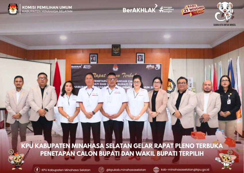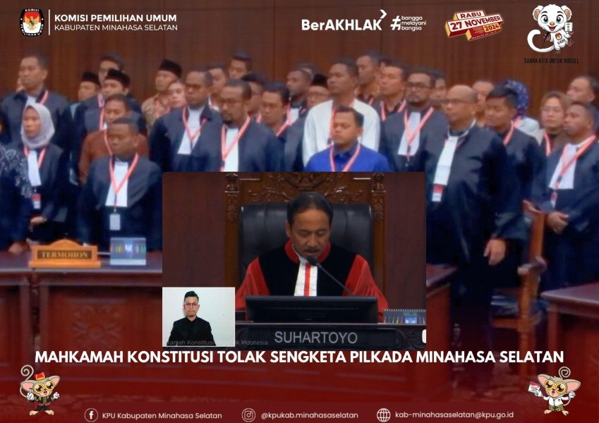 Serta petitum, dalam ekspsi Menerima eksepsi Termohon untuk seluruhnya; dan Menyatakan Permohonan yang diajukan Pemohon tidak dapat diterima. Dalam pokok permohonan, Menolak permohonan Pemohon untuk seluruhnya; Menyatakan benar dan tetap berlaku Surat Keputusan KPU Kabupaten Minahasa Selatan Nomor 1571 Tahun 2024 tentang Penetapan Hasil Pemilihan Bupati dan Wakil Bupati Kabupaten Mihanasa Selatan Tahun 2024, Tanggal 04 Desember 2024 Pukul 17:37 WITA; Menetapkan Perolehan Suara Tahap Akhir Hasil Pemilihan Bupati dan Wakil Bupati Kabupaten Minahasa Selatan Tahun 2024 yang benar adalah sebagaimana berikut : Nomor Urut 1 Frangky Dony Wongkar, SH – Theodorus Kawatu, S.IP., sebanyak 51. 575 Suara; Nomor Urut 2 Petra Yani Rembang. M.Th. – Frede Aries Massie sebanyak 43.607 Suara; Nomor Urut 3 Asiano Gamy Kawatu, SE, M.Si. – Daren Paulorino sebanyak 40.209 Suara. Selain itu, pihak Bawaslu Minahasa Selatan yang diwakili Eva J. G. Keintjem dan Alfred Franny Sengkey, serta Kuasa Pihak Terkait, P. S. Jemmy Mokolonsang, turut memberikan keterangan. KPU Minahasa Selatan berharap proses persidangan berjalan lancar dan menghasilkan keputusan yang adil sesuai dengan peraturan hukum yang berlaku.