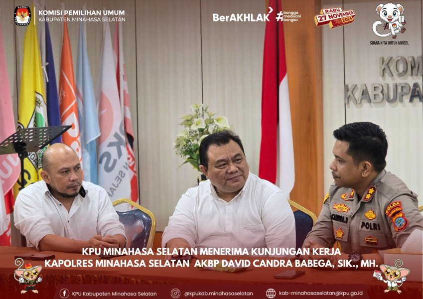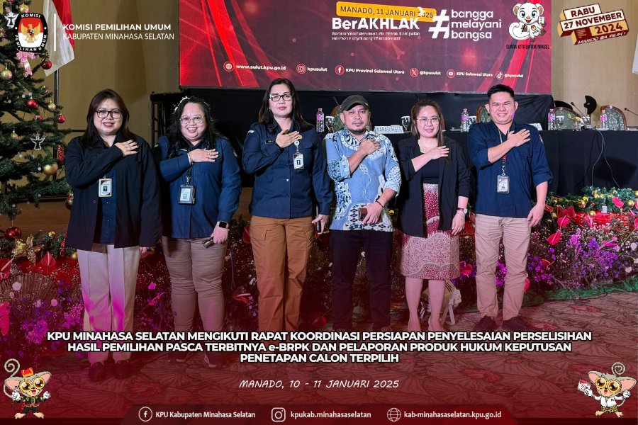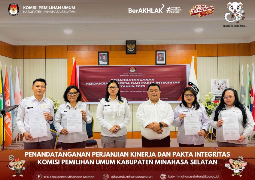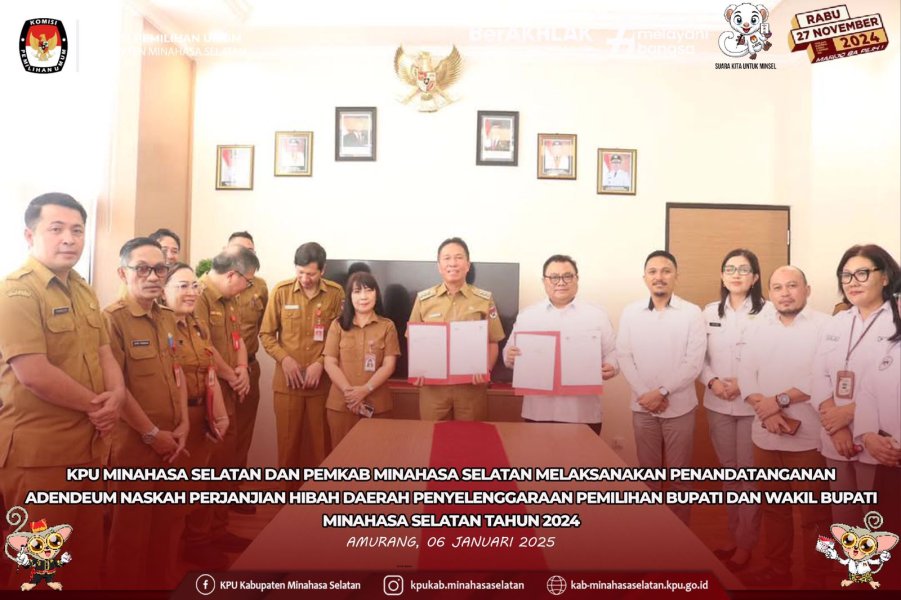 Komisi Pemilihan Umum (KPU) Kabupaten Minahasa Selatan (Minsel) Ketua dan Anggota serta Sekretaris dan jajaran Sekretariat menghadiri Kegiatan Penandatanganan Addendum NPHD Pemerintah Kabupaten Minahasa Selatan dengan KPU Kabupaten Minahasa Selatan, bertempat di Kantor Bupati Minahasa Selatan. Senin, 06/01/25.