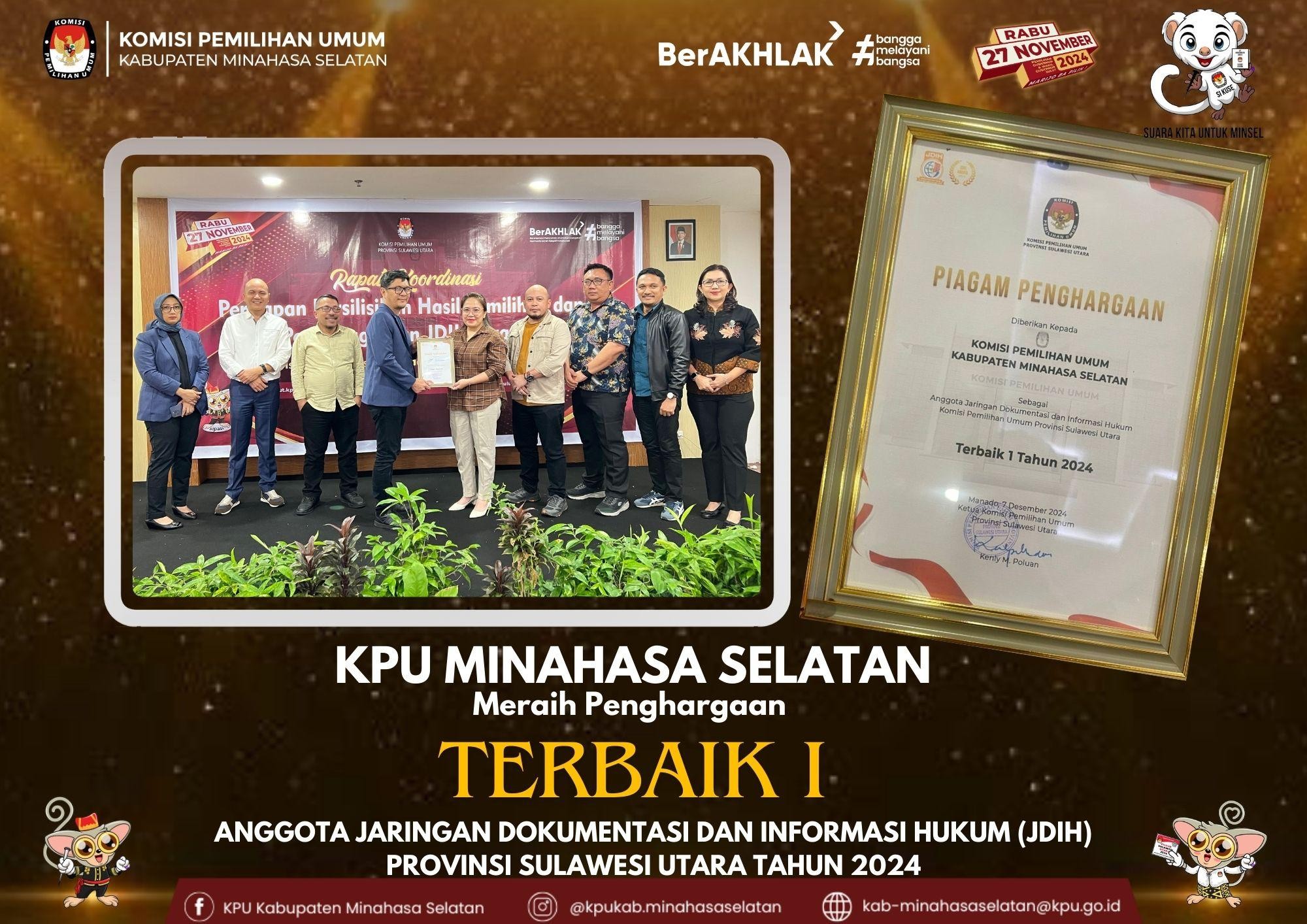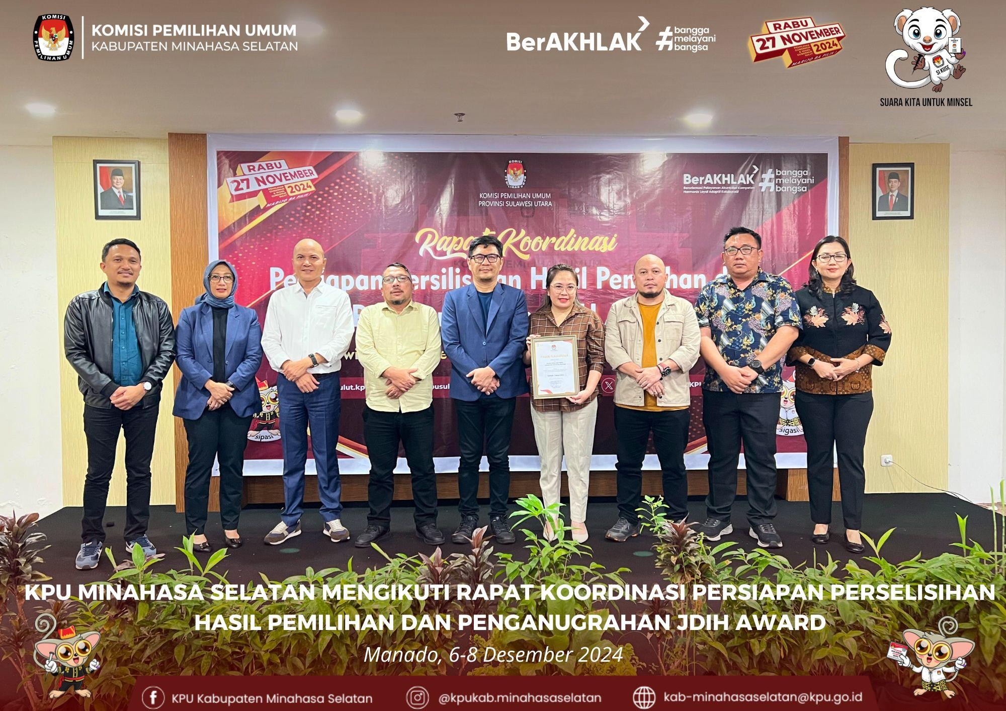 KPU Minahasa Selatan mengikuti Rapat Koordinasi Persiapan Perselisihan Hasil Pemilihan dan Penganugerahan JDIH Award Tahun 2024 yang digelar di Swissbell Hotel Manado pada 6-8 Desember 2024. Kegiatan ini dihadiri oleh Ketua dan Anggota KPU Minahasa Selatan, Sekretaris KPU Minahasa Selatan, Kasubbag yang menangani bidang hukum dan pengawasan, serta staf yang bertugas menangani tupoksi telaah hukum. Rapat ini bertujuan untuk mempersiapkan KPU Kab/Kota dalam menghadapi potensi perselisihan hasil pemilihan serta mendorong pengelolaan Jaringan Dokumentasi dan Informasi Hukum (JDIH) yang lebih baik. Dalam kegiatan tersebut, peserta mendapatkan arahan dan pembekalan teknis terkait langkah-langkah yang perlu diambil dalam menghadapi kemungkinan sengketa hasil pemilihan di Mahkamah Konstitusi. Selain itu, kegiatan ini juga menjadi momen penting untuk mengapresiasi satuan kerja yang memiliki kinerja unggul dalam pengelolaan JDIH melalui penganugerahan JDIH Award. Hal ini sejalan dengan komitmen KPU untuk terus meningkatkan tata kelola hukum dan transparansi dalam setiap tahapan pemilihan. Kehadiran KPU Minahasa Selatan menunjukkan kesiapan dan komitmen lembaga dalam menyukseskan penyelenggaraan pemilihan yang demokratis dan berintegritas. Dengan mengikuti rapat koordinasi ini, KPU Minahasa Selatan diharapkan mampu mengantisipasi berbagai tantangan hukum yang mungkin terjadi serta terus berinovasi dalam pengelolaan dokumentasi dan informasi hukum untuk mendukung pelayanan publik yang optimal.