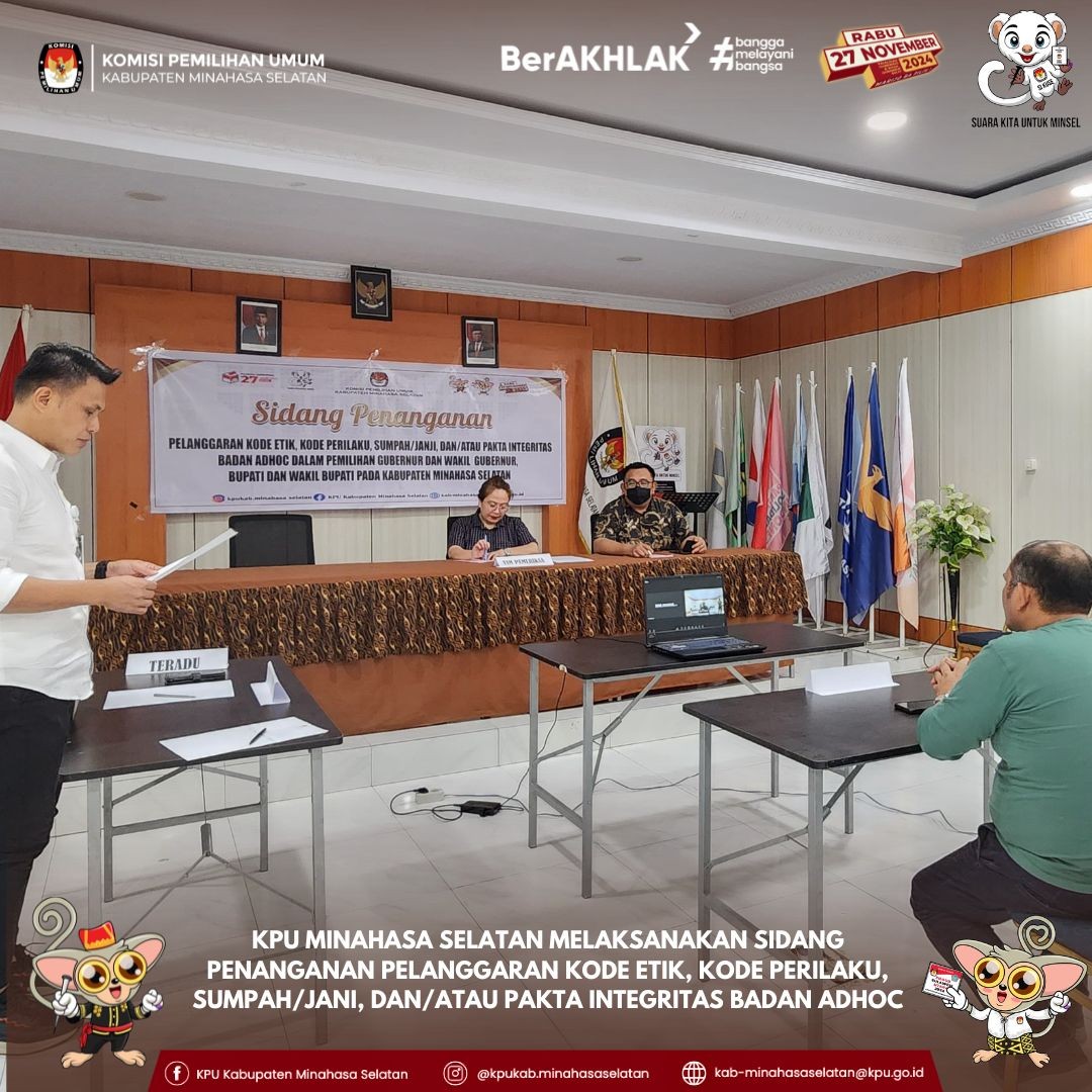 KPU Kabupaten Minahasa Selatan menggelar Sidang Penanganan Pelanggaran Kode Etik, Kode Perilaku, Sumpah/Janji, dan/atau Pakta Integritas Badan Adhoc dalam Pemilihan Gubernur dan Wakil Gubernur, serta Bupati dan Wakil Bupati Tahun 2024 (23/10/2024). Sidang ini diadakan untuk memeriksa dugaan pelanggaran yang dilakukan oleh Anggota PPK Kecamatan Motoling, Inneke Mandey. Sidang yang berlangsung pada hari ini dihadiri oleh Ketua Tim Pemeriksa, Sriwulan J. C. Suot, bersama dengan dua Anggota Tim Pemeriksa, Fauzan Sirambang (hadir secara daring) dan Hanny Porajow. Sidang ini dilaksanakan berdasarkan hasil pengawasan internal KPU Kabupaten Minahasa Selatan, sebagaimana diatur dalam ketentuan Keputusan KPU Nomor 337/HK.06.2-Kpt/01/KPU/VII/2020. Dalam persidangan, saksi Olfer Sengkey dihadirkan untuk memberikan keterangan terkait dugaan pelanggaran yang dilakukan oleh teradu. Proses persidangan berfokus pada klarifikasi bukti-bukti yang ada serta pembelaan dari pihak teradu. Sidang ini merupakan bagian dari komitmen KPU Minsel dalam menjaga integritas dan profesionalisme penyelenggara Pilkada Tahun 2024 di Kabupaten Minahasa Selatan di setiap tingkatan. Dengan adanya mekanisme pemeriksaan ini, diharapkan setiap pelanggaran yang berpotensi merusak kredibilitas pemilihan dapat ditangani secara transparan dan tegas. Keputusan akhir dari persidangan akan ditentukan berdasarkan fakta-fakta yang terungkap selama proses berlangsung.