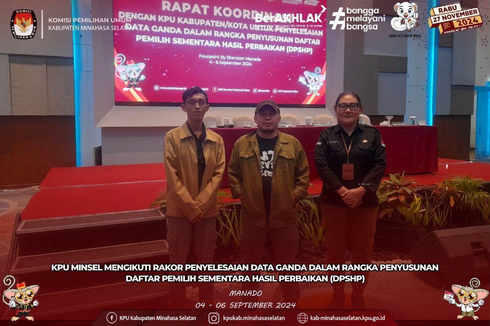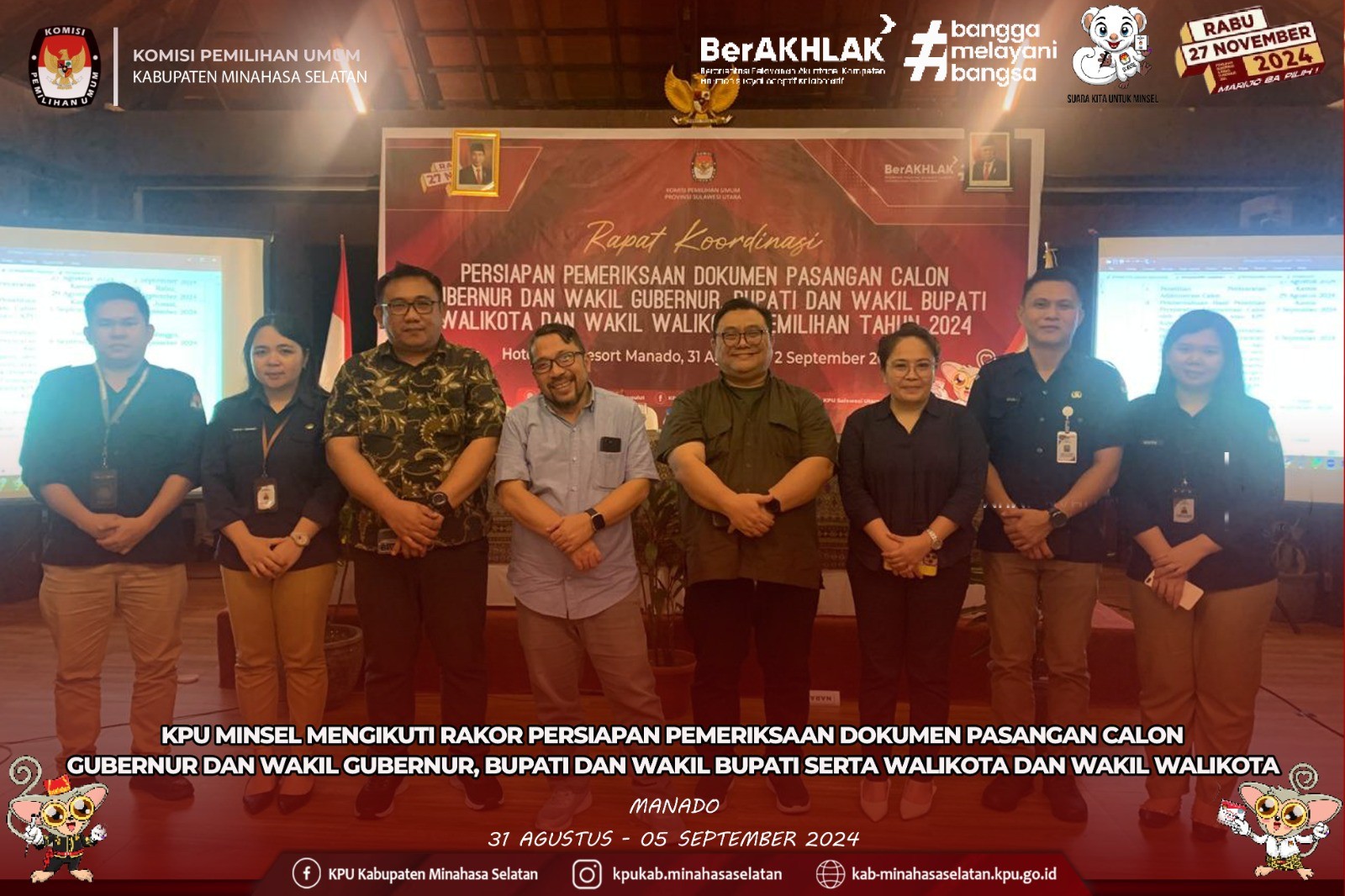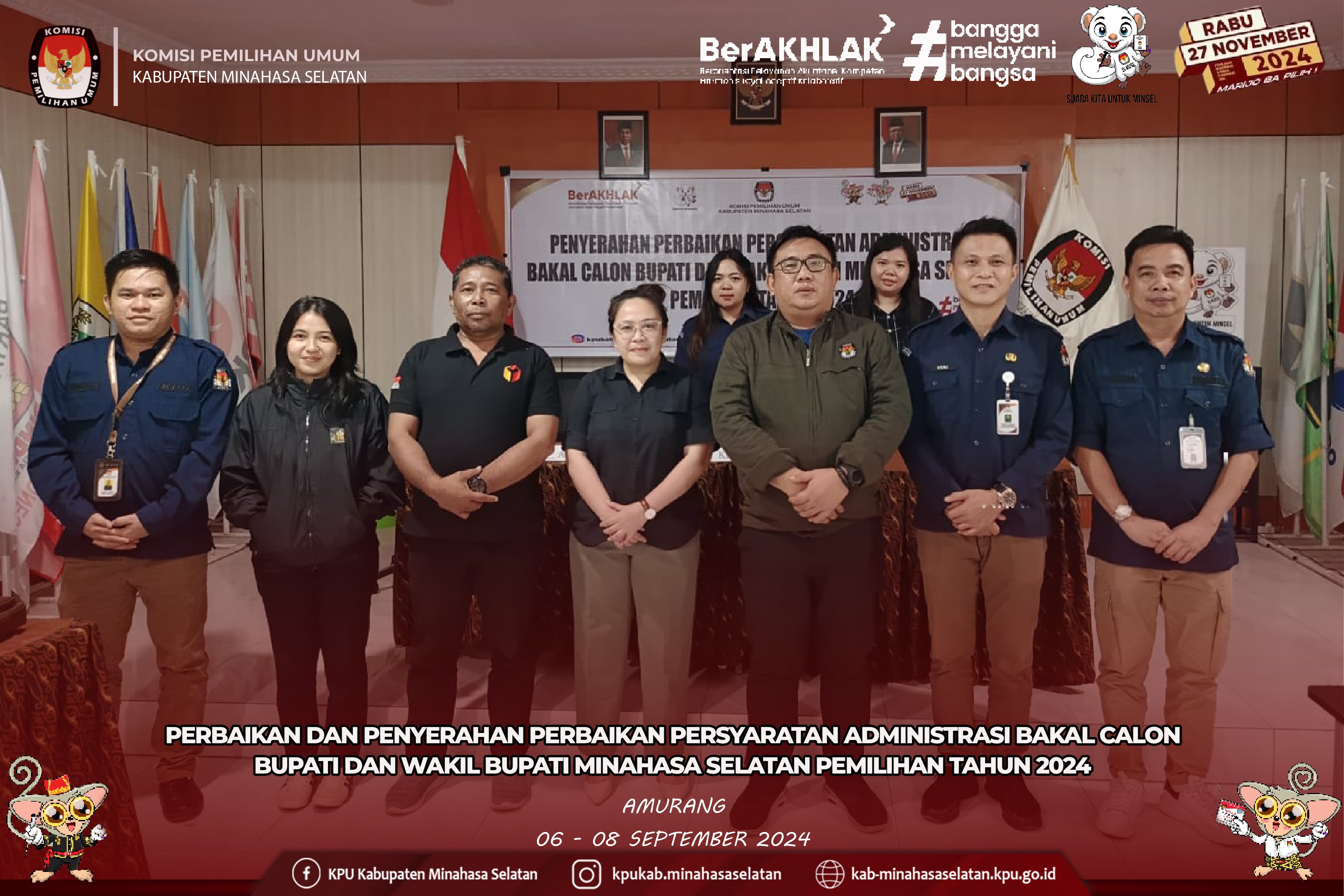 KPU Minahasa Selatan melaksanakan tahapan Perbaikan dan Penyerahan Perbaikan Persyaratan Administrasi Bakal Calon Bupati dan Wakil Bupati Minahasa Selatan dalam Pemilihan Tahun 2024* Tahapan Perbaikan dan Penyerahan Perbaikan Persyaratan Administrasi Bakal Calon Bupati dan Wakil Bupati Minahasa Selatan dalam Pemilihan Tahun 2024, dilaksanakan pada tanggal 6-8 September 2024. Registrasi hari pertama dan kedua dibuka pukul 08.00-16.00 WITA Hari ketiga sekaligus hari terakhir sampai pukul 23.59 WITA. KPU Minahasa Selatan menerima dokumen perbaikan persyaratan administrasi dari 3 (Tiga) bakal pasangan calon Bupati dan Wakil Bupati Minahasa Selatan. Yaitu tim bakal pasangan calon Petra Yani Rembang dan Frede Aries Massie, yang mengantarkan dokumen perbaikan persyaratan administrasi pasangan calon mereka di Kantor KPU Kabupaten Minahasa Selatan pada tanggal 7 September 2024 dan menyampaikan dokumen perbaikan pada pukul 14.58 WITA Selanjutnya disusul tim bakal pasangan calon Asiano Gamy Kawatu dan Deren Paulorino, mengantarkan dokumen perbaikan persyaratan administrasi pasangan calon mereka di Kantor KPU Kabupaten Minahasa Selatan. dan melakukan registrasi pada pukul 15.52 WITA Dan yang terakhir dari tim bakal pasangan calon Franky Donny Wongkar dan Theodorus Kawatu, mengantarkan dokumen perbaikan persyaratan administrasi pasangan calon mereka di Kantor KPU Kabupaten Minahasa Selatan. dan melakukan registrasi pada pukul 15.55 WITA. Setelah dilakukan pemeriksaan dokumen persyaratan administrasi. Ketiga tim pasangan calon dinyatakan berstatus DITERIMA oleh KPU Kabupaten Minahasa Selatan Turut hadir dalam Perbaikan dan Penyerahan Perbaikan Persyaratan Administrasi Bakal Calon Bupati dan Wakil Bupati Minahasa Selatan Pimpinan Bawaslu Minahasa Selatan bersama staf, Registrasi ditutup pada pukul 23.59 WITA.