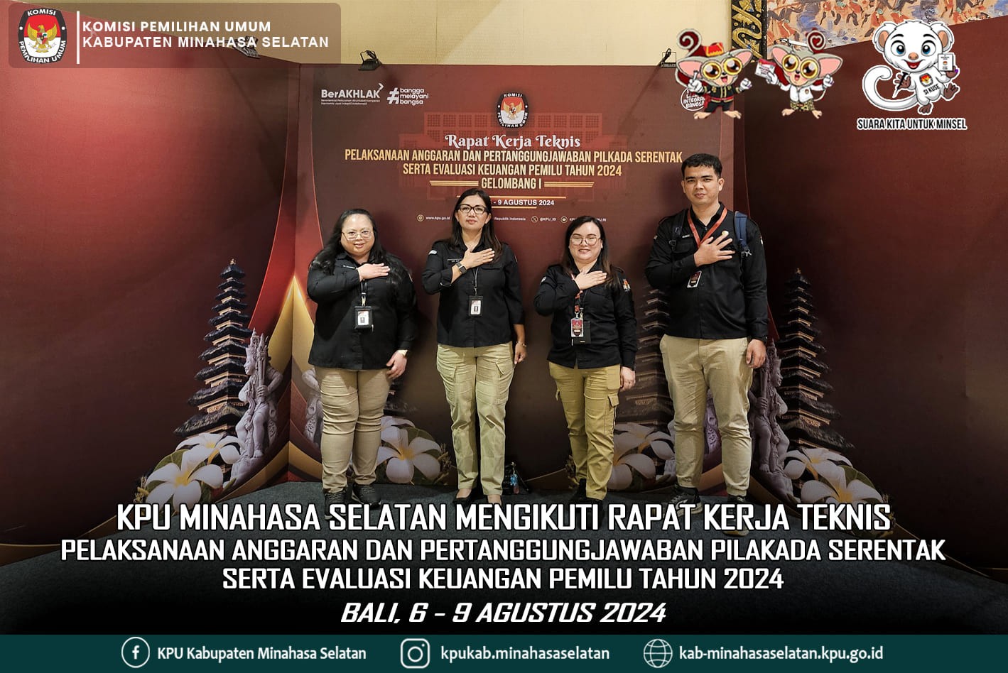 Komisi Pemilihan Umum Kabupaten Minahasa Selatan mengikuti Rapat Kerja Teknis Pelaksanaan Anggaran Dan Pertanggungjawaban Pilkada Serentak Serta Evaluasi Keuangan Pemilu Tahun 2024 (Gelombang I) yang dilaksanakan di The Trans Resort Bali pada tanggal 6 sampai dengan 9 Agustus 2024. Rapat Kerja Teknis ini diikuti oleh Sekretaris Komisi Pemilihan Umum Kabupaten Minahasa Selatan Ibu Lani Alou, Kasubbag Keuangan Umum dan Logistik Christina Tulungen serta Bendahara Pengeluaran Ria Runtunuwu dan Bendahara Pengeluaran Pembantu Gilbert Siagian. Kegiatan Rapat Kerja Teknis ini dibuka oleh Kepala Biro Keuangan Sekretaris Jenderal Komisi Pemilihan Umum Republik Indonesia Ibu Yayu Yuliani bersama dengan Inspektur Utama Sekretaris Jenderal Komisi Pemilihan Umum Republik Indonesia Bapak Nanang Priyatna, dilanjutkan dengan pembacaan laporan pelaksanan kegiatan dan arahan pimpinan serta materi dari para narasumber. Peserta dalam Kegiatan Rapat Kerja Teknis Pelaksanaan Anggaran Dan Pertanggungjawaban Pilkada Serentak Serta Evaluasi Keuangan Pemilu Tahun 2024 (Gelombang I) ini adalah Kuasa Pengguna Anggaran, Pejabat Pembuat Komitmen, Kepala Sub Bagian Keuangan Umum dan Logistik, Bendahara Pengeluaran dan Bendahara Pengeluaran Pembantu dari KPU Provinsi dan KPU Kabupaten/Kota yang tersebar di 11 (sebelas) satuan kerja di Provinsi yang telah dijadwalkan. Selanjutnya, arahan pimpinan serta menutup seluruh rangkaian Kegiatan Rapat Kerja Teknis Pelaksanaan Anggaran Dan Pertanggungjawaban Pilkada Serentak Serta Evaluasi Keuangan Pemilu Tahun 2024 (Gelombang I) secara resmi oleh Kepala Biro Keuangan Sekretaris Jenderal Komisi Pemilihan Umum Republik Indonesia Ibu Yayu Yuliani beserta Inspektur Wilayah I Bapak Bahtiar dan diakhiri dengan sesi foto bersama pada hari terakhir kegiatan.