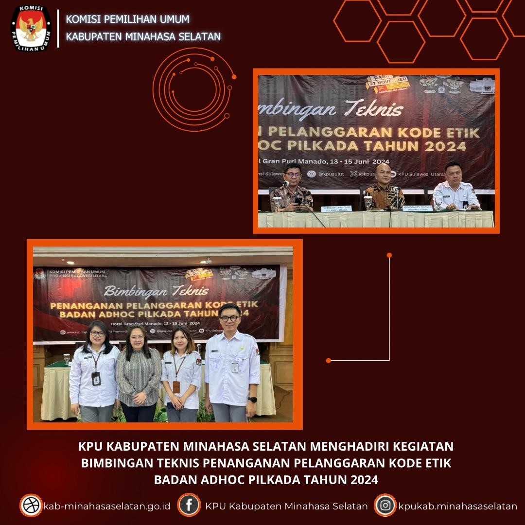 Kegiatan Bimbingan Teknis dihadiri Anggota DKPP RI Ibu Ratna Dewi Pettalolo, Ketua Divisi Perncanaan Data dan Informasi KPU Provinsi Sulawesi Utara Lani Ointu, Ketua Divisi Sosialisasi, Pendidika Pemilih, Partisipasi Masyarakat dab SDM KPU Provinsi Sulawesi Utara Awaluddin Umbola. Peserta Bimbingan Teknis yaitu 531 anggota Panitia Pemungutan Suara dan 85 Anggota Panitia Pemilihan Kecamatan sebagai pendamping. Kegiatan ditutup oleh Ketua KPU Kabupaten Minahasa Selatan Tomy Moga.