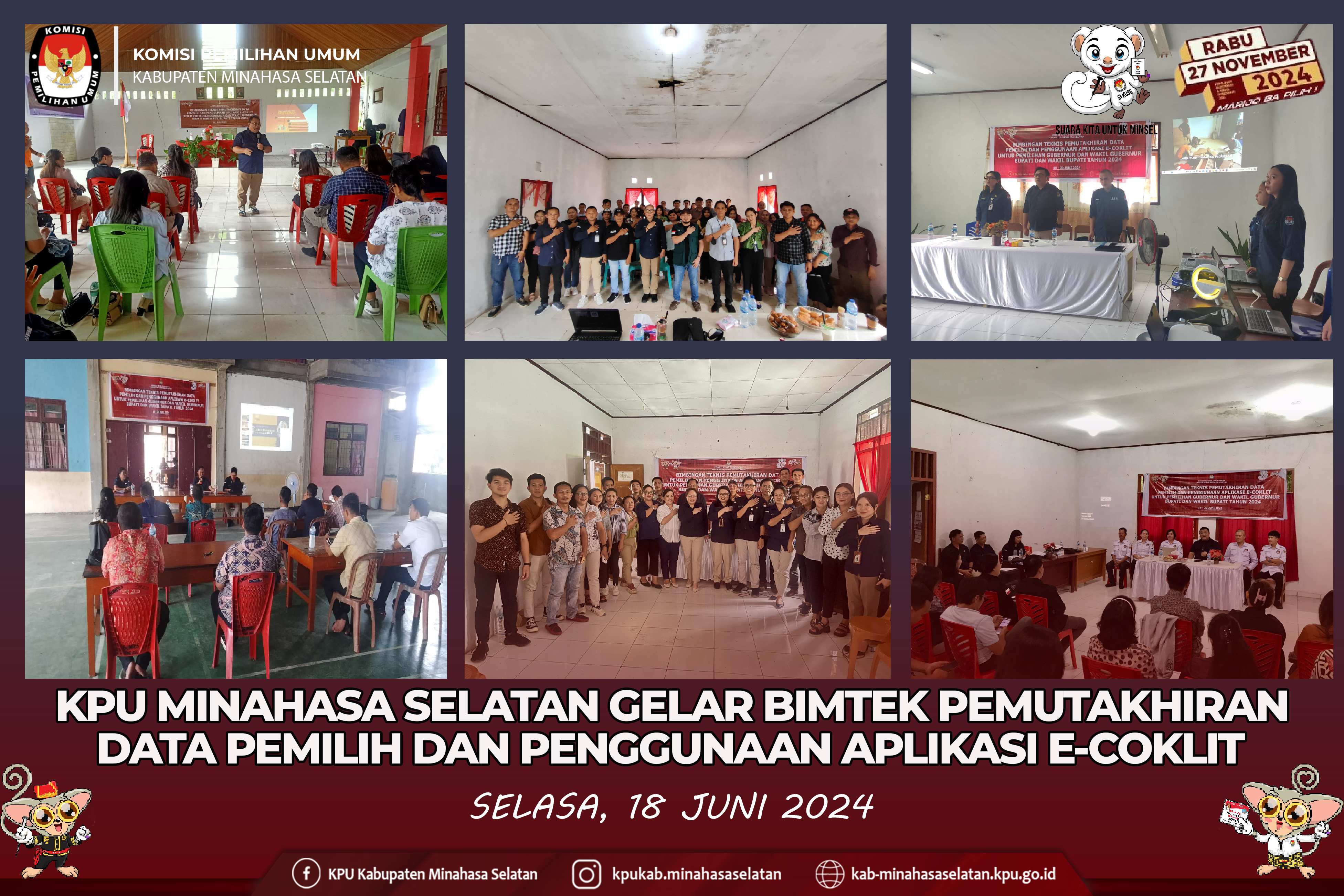 Bimtek di buka oleh Ketua KPU Kabupaten Minahasa Selatan Tomy Moga bersama dengan Ketua Divis Sosialisasi, Pendidikan Pemilih, Partisipasi Masyarakat dan SDM Fauzan Sirambang, Ketua Divisi Perencanaan, Data dan Informasi Fadly Munaiseche, Ketua Divisi Hukum dan Pengawasan Sriwulan Suot, dan Ketua Divisi Teknis Penyelenggaraan Hanny Porajow, bersama Sekretaris KPU Kabupaten Minahasa Selatan Lani Alou.