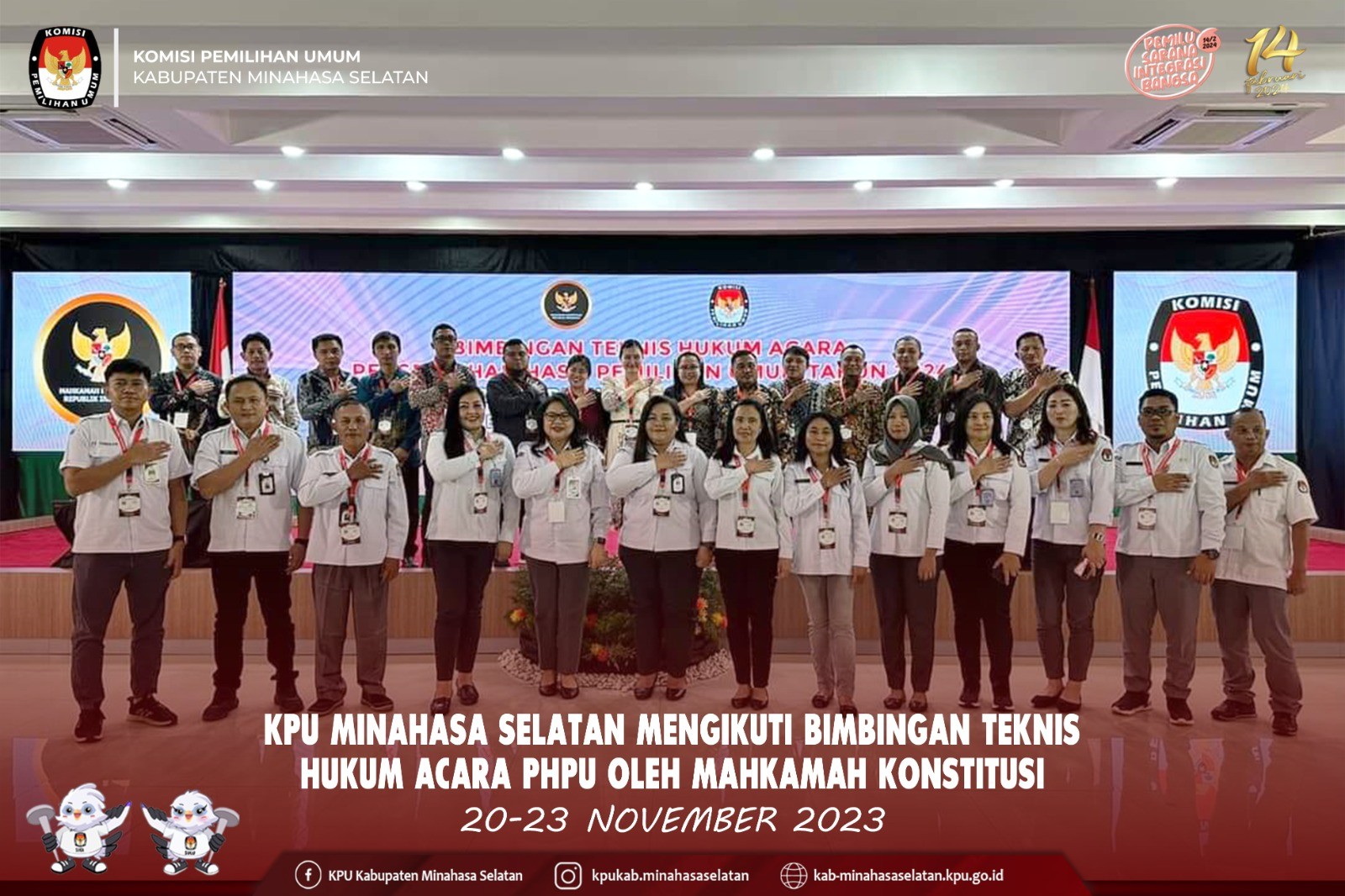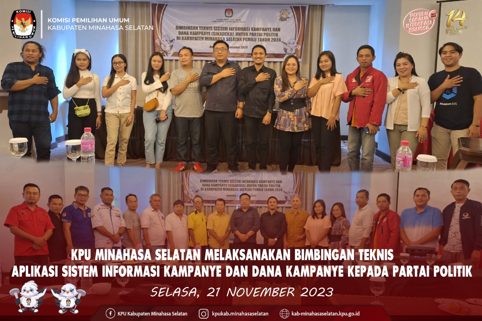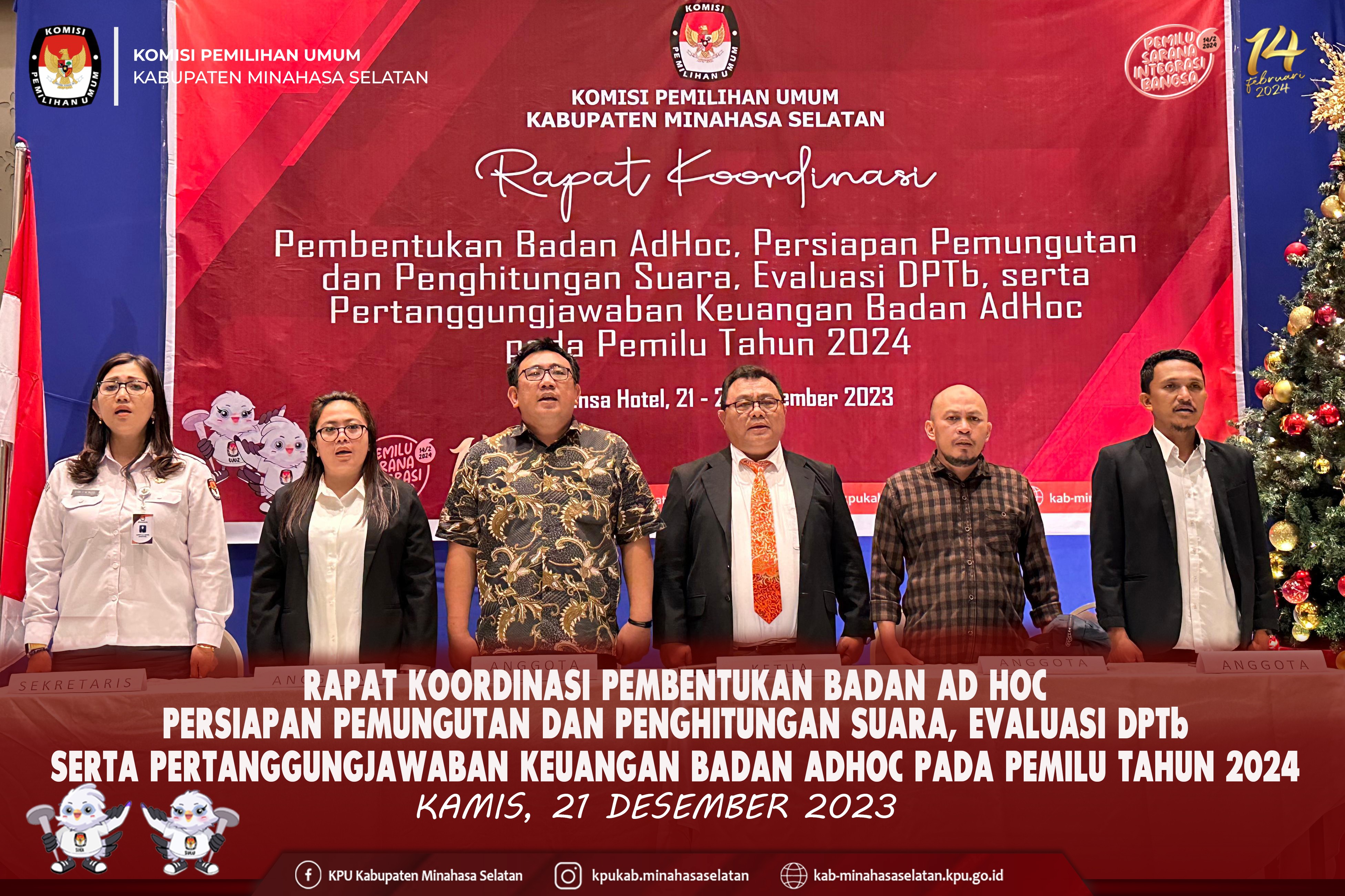 Manado, Pemilihan Umum (Pemilu) 2024 di depan mata. Tahapan demi tahapan dibesut Komisi Pemilihan Umum (KPU). Di tengah kesibukkan menjabarkan tahapan pemilu, KPU Minahasa Selatan menggelar Ibadah Natal. Kali ini, perayaan melibatkan keluarga besar Panitia Pemilihan Kecamatan (PPK). Ibadah dengan mengusung tema “Natal dan Pemilu sebagai Sarana Integrasi di Tengah Pluralisme Bangsa”, dipimpin oleh Pdt. Deysi Maya Pepah, Sth Membawakan sambutan, Ketua KPU Minahasa Selatan Tomy Moga, mengajak seluruh jajaran penyelenggara dan sekretariat yang hadir untuk bersama-sama mengucap syukur. “Karena, dimomen ini kita dapat merayakan Natal Yesus Kristus di tengah kepadatan tahapan yang sementara berjalan. Syukur, kita boleh bersama-sama dalam ibadah Natal ini,” ungkap Moga didampingi Anggota KPU Minahasa Selatan Sriwulan J.C. Suot, Hanny J. Porajow, Fauzan Sirambang, Fadly Munaiseche dan Sekretaris Lani L.A. Alou beserta Pejabat Struktural KPU Minahasa Selatan.