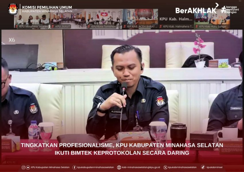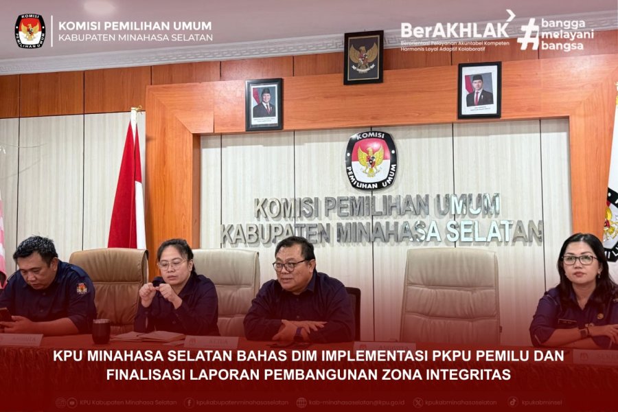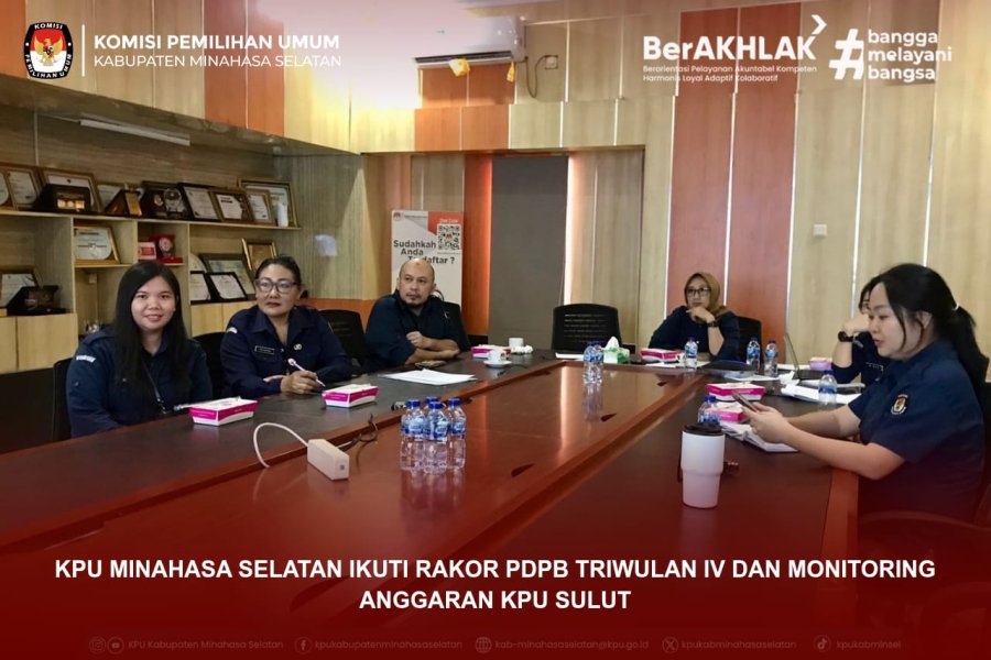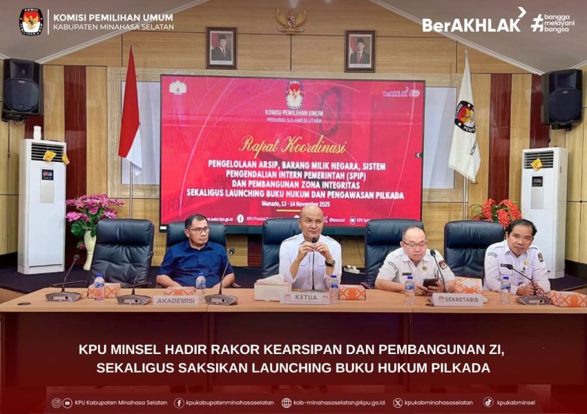 Manado – Komisi Pemilihan Umum (KPU) Kabupaten Minahasa Selatan mengikuti Rapat Koordinasi Kearsipan, Barang Milik Negara (BMN), Sistem Pengendalian Intern Pemerintah (SPIP), dan Pembangunan Zona Integritas (ZI) yang dirangkaikan dengan Launching Buku Hukum dan Pengawasan Pilkada. Kegiatan ini digelar pada Kamis, 13 November 2025 di Aula Kantor KPU Provinsi Sulawesi Utara. Rapat koordinasi tersebut menjadi wadah strategis bagi jajaran KPU se-Sulawesi Utara untuk memperkuat tata kelola internal dan meningkatkan kualitas penyelenggaraan kepemiluan. Dari KPU Kabupaten Minahasa Selatan, kegiatan ini dihadiri oleh Ketua KPU, Ketua Divisi Hukum, Sekretaris, serta Kepala Sub Bagian Keuangan, Umum, dan Logistik. Dalam kegiatan ini, sejumlah penekanan penting disampaikan, khususnya terkait urgensi pengelolaan aset dan dokumen secara tertib, akuntabel, dan transparan. Pengelolaan BMN yang baik tidak hanya mencerminkan pertanggungjawaban publik, tetapi juga mendukung efisiensi lembaga. Sementara itu, penataan kearsipan yang terstruktur menjadi elemen vital dalam menjaga kelestarian arsip untuk kebutuhan layanan publik di masa depan. Pada aspek pembangunan Zona Integritas, Rakor menekankan penguatan komitmen KPU dalam mewujudkan Wilayah Bebas dari Korupsi (WBK) dan Wilayah Birokrasi Bersih dan Melayani (WBBM) melalui peningkatan integritas serta budaya kerja berorientasi pelayanan. Puncak kegiatan ditandai dengan Launching Buku Hukum dan Pengawasan Pilkada yang disusun oleh Divisi Hukum dan Pengawasan KPU Provinsi Sulawesi Utara. Ketua Divisi Hukum dan Pengawasan menjelaskan bahwa penerbitan buku ini merupakan kontribusi nyata untuk memperkaya referensi pengetahuan kepemiluan di Indonesia. Buku tersebut diharapkan menjadi rujukan bagi penyelenggara pemilu, akademisi, serta pemangku kepentingan lainnya. Acara peluncuran ditandai dengan penekanan tombol publish ke laman Monografi Jaringan Dokumentasi dan Informasi Hukum (JDIH) KPU, dilanjutkan dengan penyerahan buku kepada para penulis dan editor.
