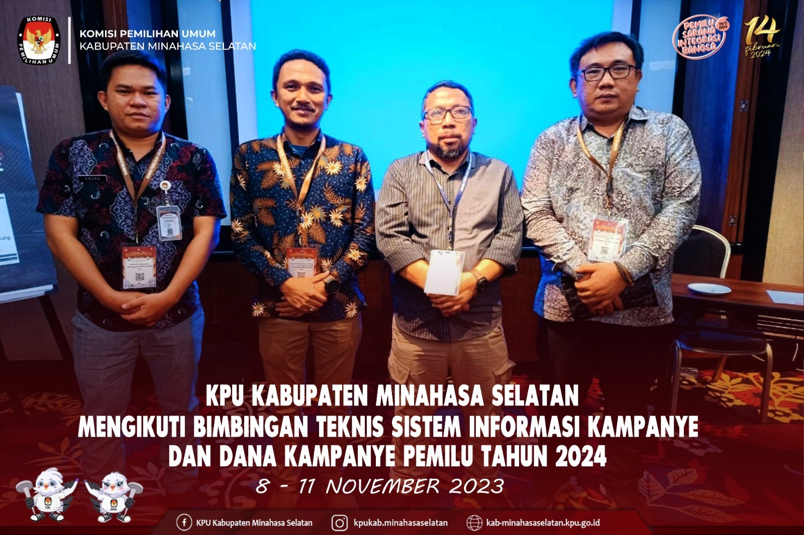 Amurang - Komisi Pemilihan Umum Kabupaten Minahasa Selatan mengikuti kegiatan Bimbingan Teknis (Bimtek) Sistem Informasi Kampanye dan Dana Kampanye (Sikadeka) Pemilu Tahun 2024 yang dilaksanakan pada tanggal 8 – 11 November 2023 di Hotel Ibis Trans Studio Bandung, Kota Bandung, Provinsi Jawa Barat. Hadir dalam kegiatan tersebut KPU Minahasa Selatan yakni Kadiv Teknis Penyelengaraan, Hanny J. Porajow, Kadiv Sosdiklih, Parmas dan SDM, Fauzan Sirambang dan Tenaga Administras. Kegiatan Bimtek ini dibuka langsung oleh Ketua KPU Republik Indonesia, Hasyim Asyari, yang menyampaikan bahwa KPU telah menetapkan Daftar Calon Tetap (DCT) selanjutnya KPU akan melaksanakan tahapan Kampanye yang semakin dekat, untuk itu setiap satker diminta untuk fokus dalam melaksanakan setiap tahapan yang berlangsung. “Bimtek ini untuk menfasilitasi penggunaan Sikadeka yang nantinya digunakan sebagai alat bantu pelaksanaan Kampanye dan Dana Kampanye. Oleh karena itu diminta untuk setiap Satker untuk memahami secara menyeluruh pelaksanaan kampanye dan dana kampanye dan fokus dalam mengikuti bimtek.” Turut hadir dalam kegiatan Anggota KPU RI, Idham Kholik dan Parsadaan Harahap, Jajaran Komisioner KPU Provinsi Jawa Barat, Deputi Bidang Dukungan Teknis, Eberta Kawima dan Kepala Biro Teknis Penyelengaraan, Melgia Carolina Van Harling. Peserta terdiri dari Anggota KPU Provinsi dan Kabupaten/Kota yang membidangi Divisi Teknis Penyelenggaraan dan Divisi Sosialisasi Pendidikan Pemilih Partisipasi Masyarakat dan SDM, beserta Kabag/Kasubbag yang membidangi Teknis Penyelenggaraan Pemilu, serta Operator Sikadeka.