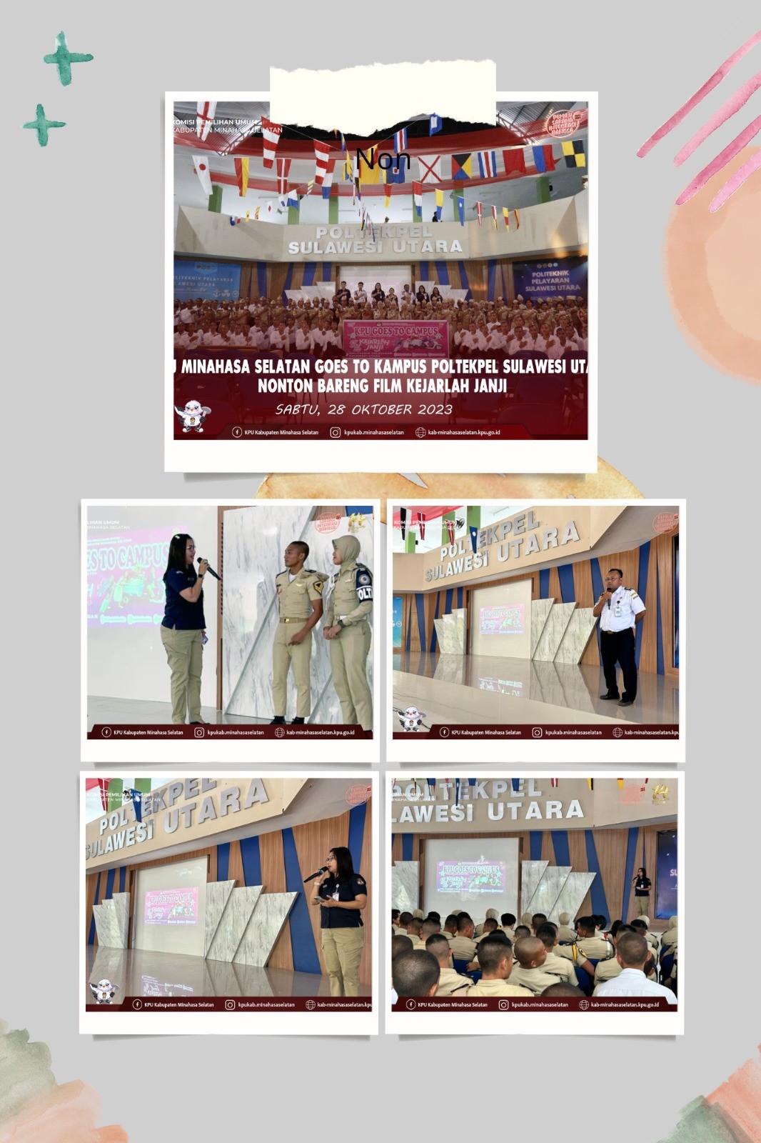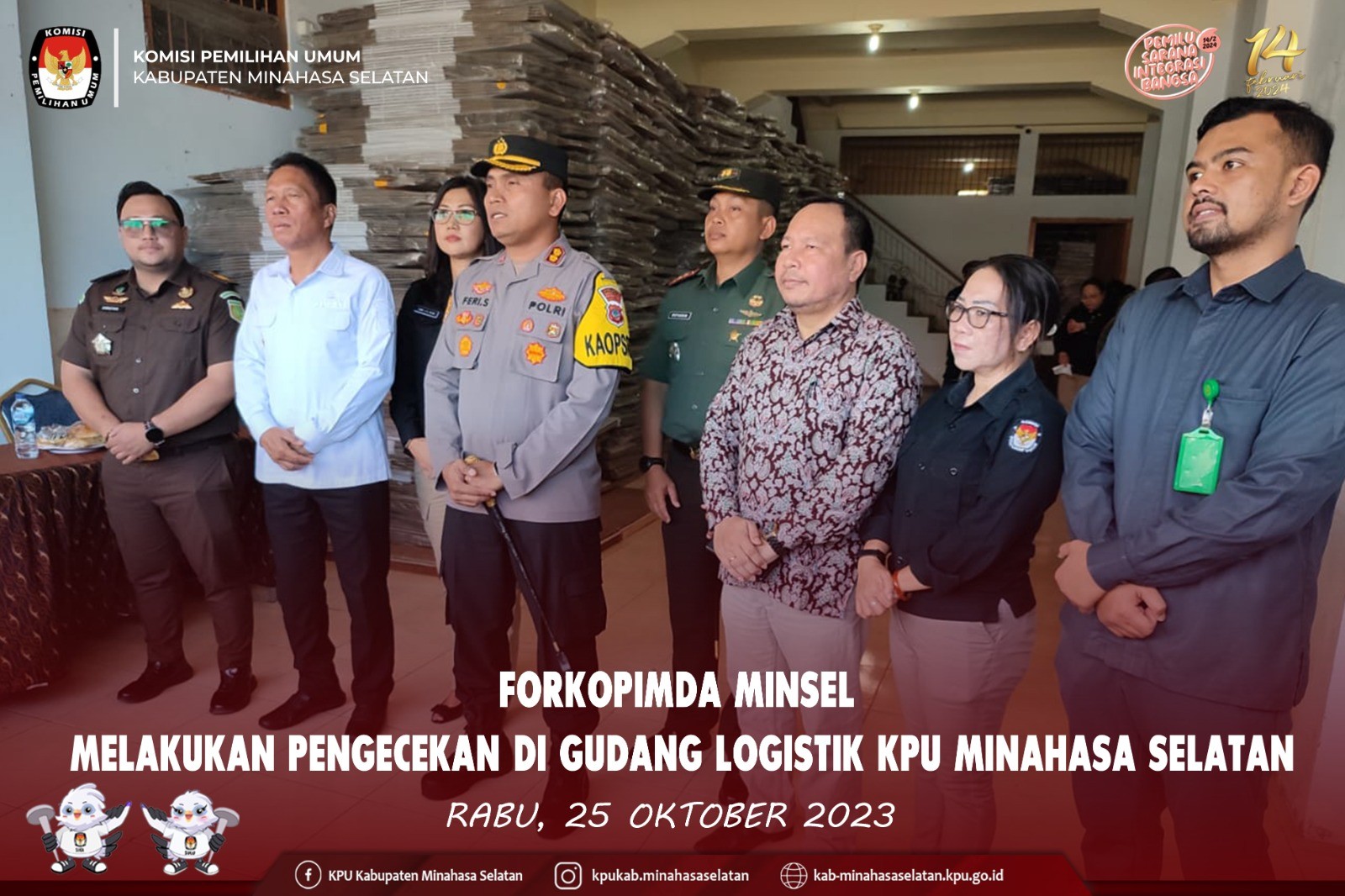 Rabu 25 Oktober 2023 pukul 10.00 wita,Forkopimda Kabupaten Minahasa Selatan melakukan peninjauan Gudang Logistik Pemilu KPU Kabupaten Minahasa Selatan, yang terletak di Kompleks Ruko Pasar 54 Amurang Kel. Uwuran Satu Lingk. IV Kec. Amurang. Peninjauan Gudang Logistik KPU Kab. Minsel dilakukan untuk memastikan kesiapan gudang logistik dan mengecek jika ada kendala atau permasalahan yang dapat mempengaruhi penyimpanan dan distribusi logistik pada Pemilu Serentak Tahun 2024. Pelaksanaan Peninjauan Gudang Logistik KPU Kab. Minsel oleh Forkopimda, dihadiri oleh Bupati Minahasa Selatan. Franky D. Wongkar SH. Kapolres Minsel AKBP Feri R. Sitorus, SH., SIK. Dandim 1302 / Minahasa LETKOL INF Mutakbir. Kajari Minsel yang diwakili oleh Kasie Intel Christian E. Singal, SH. Ketua Pengadilan Negeri Amurang yang diwakili oleh M. Sabil Riyandika, SH., MH. Assisten 1 Setda Kab. Minsel . Drs. Benny V. J. Lumingkewas. Assisten 2 Setda Kab. Minsel Frangki T. Tangkere, SP., M.Si. Kabag Ops / Karendal Ops Matap Brata 2023 - 2024 Satgas Polres Minsel AKP Verry Liwutang, SH., bersama dengan beberapa Kasatgas. Kepala Badan Kesbangpol Kab.Minsel, Ifke Pondaag Kapolsek Amurang IPTU Jotje Pajow, SE. Camat Amurang Petrus Ulaan, ST. Peninjauan Gudang Logistik KPU Kab. Minsel oleh Forkopimda diterima langsung oleh Ketua dan Anggota KPU Kabupaten Minahasa Selatan serta Sekretaris KPU Kabupaten Minahasa Selatan yang kemudian penyampaikan beberapa penjelasan terkait kondisi Gudang Logistik yang ada.