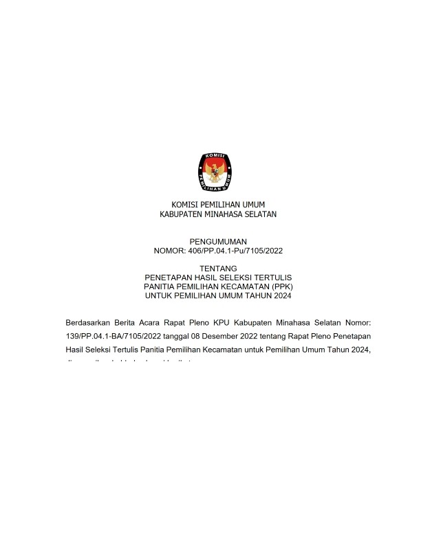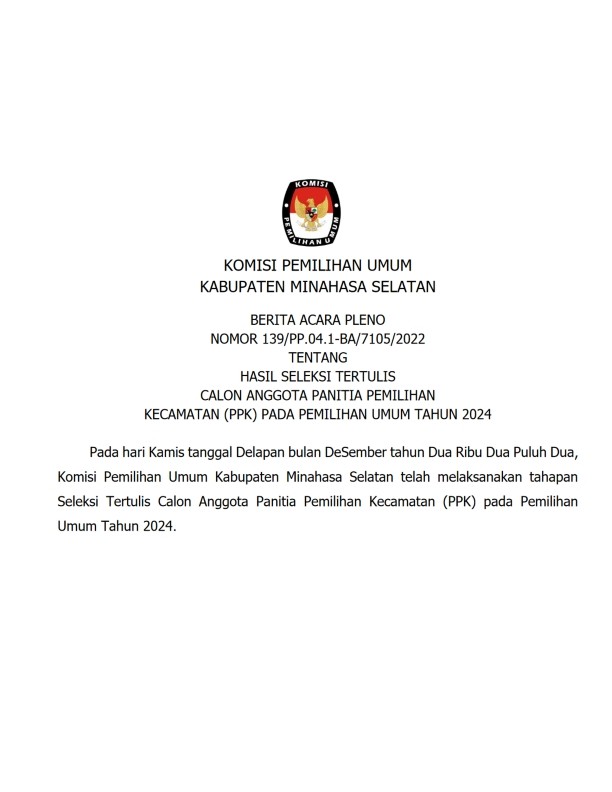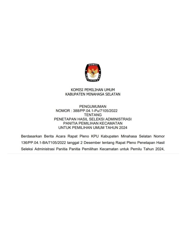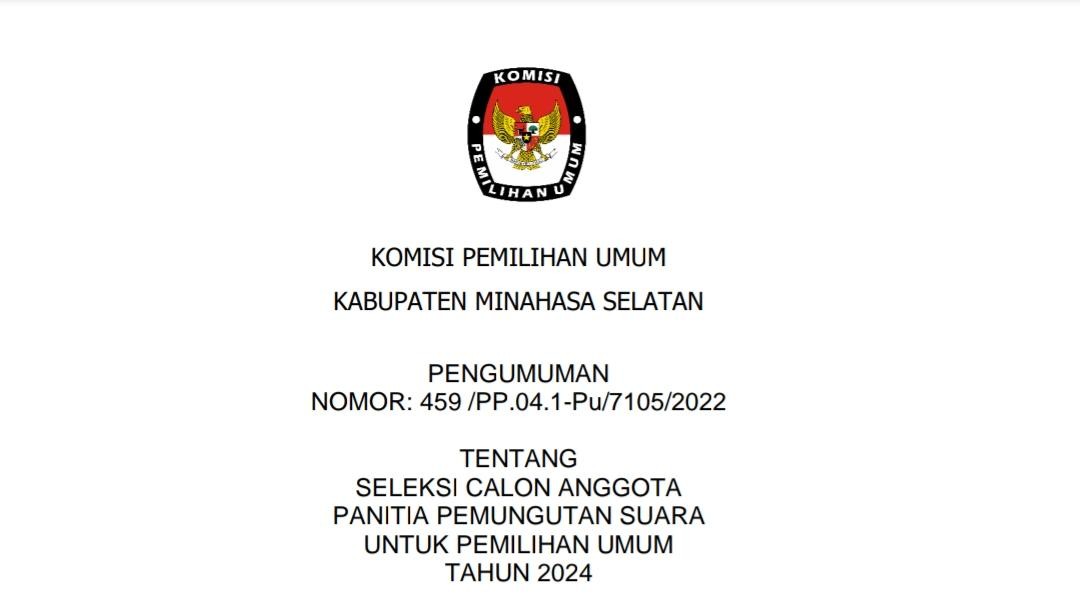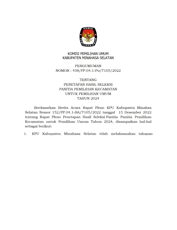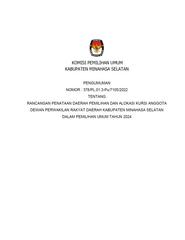 Amurang, 23/11/2022, Komisi Pemilihan Umum Kabupaten Minahasa Selatan hari ini mengumumkan Rancangan Penataan Daerah Pemilihan dan Alokasi Kursi Anggota Dewan Perwakilan Rakyat Daerah Minahasa Selatan dalam Pemilihan Umum Tahun 2024 berdasarkan Berita Acara Komisi Pemilihan Umum Minahasa Selatan Nomor : 132/PL.01.3-BA/7105/2022 tentang Rancangan Penataan Daerah Pemilihan dan Alokasi Kursi Anggota Dewan Perwakilan Rakyat Daerah Kabupaten Minahasa Selatan dalam Pemilihan Umum Tahun 2024, untuk itu diharapkan masyarakat dapat memberi tanggapan dan masukan sebagaimana tercantum dalam lampiran pengumuman ini.