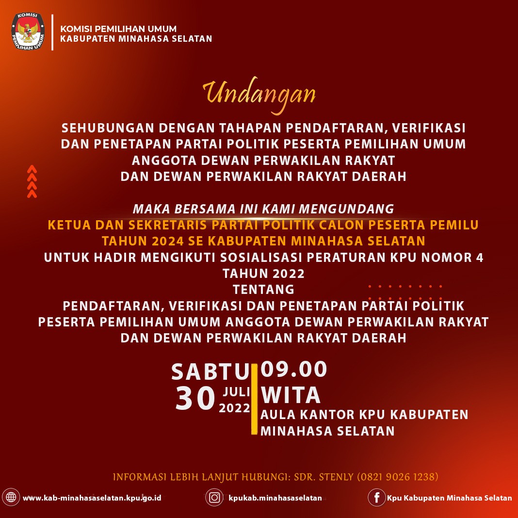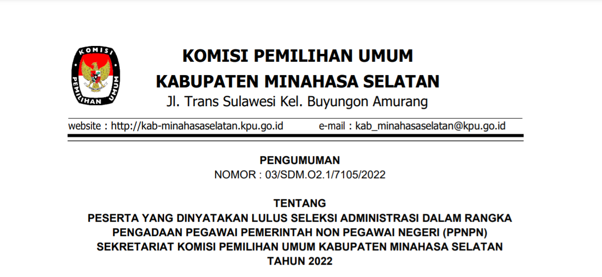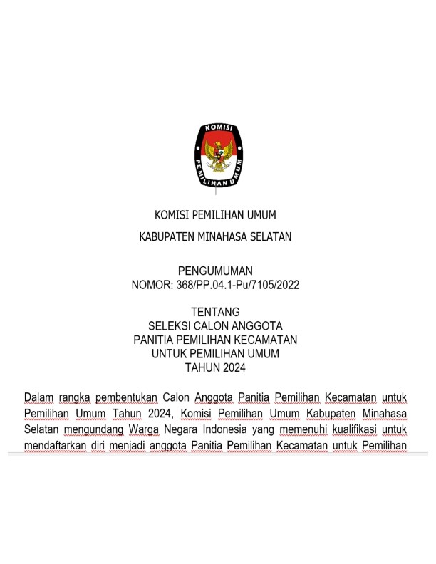 Dalam rangka pembentukan Calon Anggota Panitia Pemilihan Kecamatan, untuk Pemilihan Umum Tahun 2024, Komisi Pemilihan Umum Kabupaten Minahasa Selatan, mengundang Warga Negara Indonesia yang memenuhi persyaratan untuk mendaftarkan diri menjadi anggota Panitia Pemilihan Kecamatan untuk Pemilihan Umum Tahun 2024 dengan ketentuan sebagai berikut: