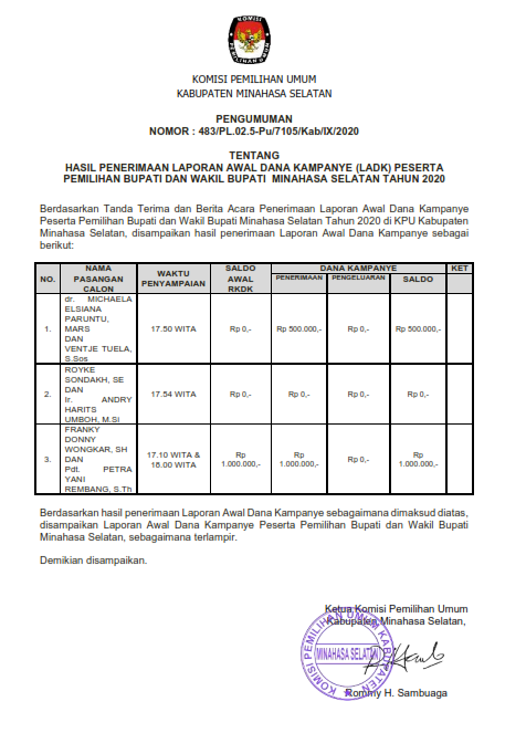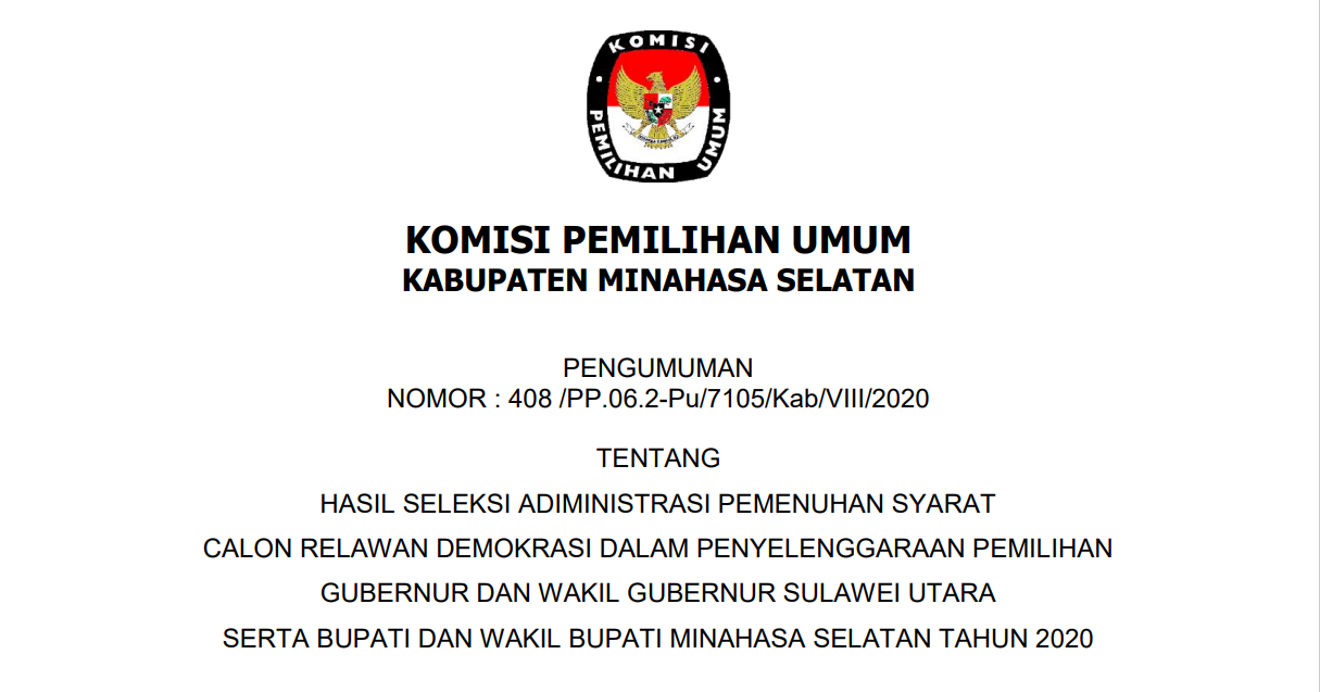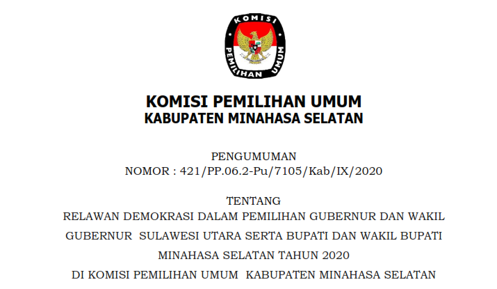 untuk itu Komisi Pemilihan Umum Kabupaten Minahasa Selatan mengumumkan Nomor Urut dan Daftar Pasangan Calon Peserta Pemilihan Bupati dan Wakil Bupati Minahasa Selatan Tahun 2020 yang dapa di unduh pada menu download di bawah.