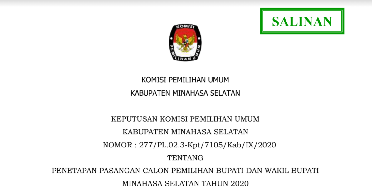 Keputusan Komisi Pemilihan Umum Kabupaten Minahasa Selatan Nomor : 278/PL.02.3-Kpt/7105/Kab/IX/2020 tentang Penetapan Nomor Urut dan Daftar Pasangan Calon Peserta Pemilihan Bupati dan Wakil Bupati Minahasa Selatan Tahun 2020,