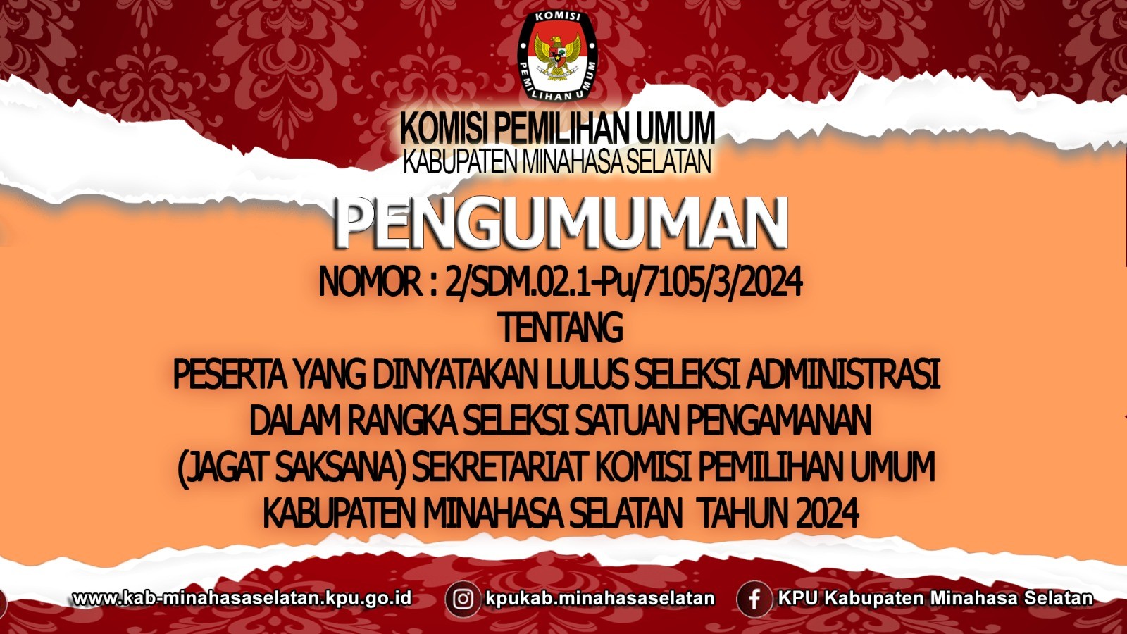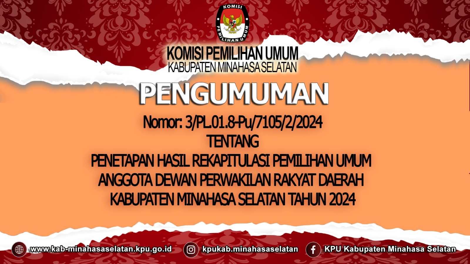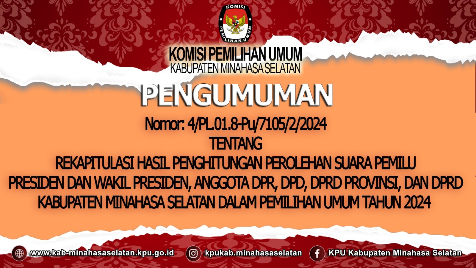 Komisi Pemilihan Umum Kabupaten Minahasa Selatan mengumumkan Rekapitulasi Hasil Penghitungan Perolehan Suara Pemilu Presiden dan Wakil Presiden, Anggota DPR, DPD, DPRD Provinsi, dan DPRD Kabupaten Minahasa Selatan Dalam Pemilihan Umum Tahun 2024.