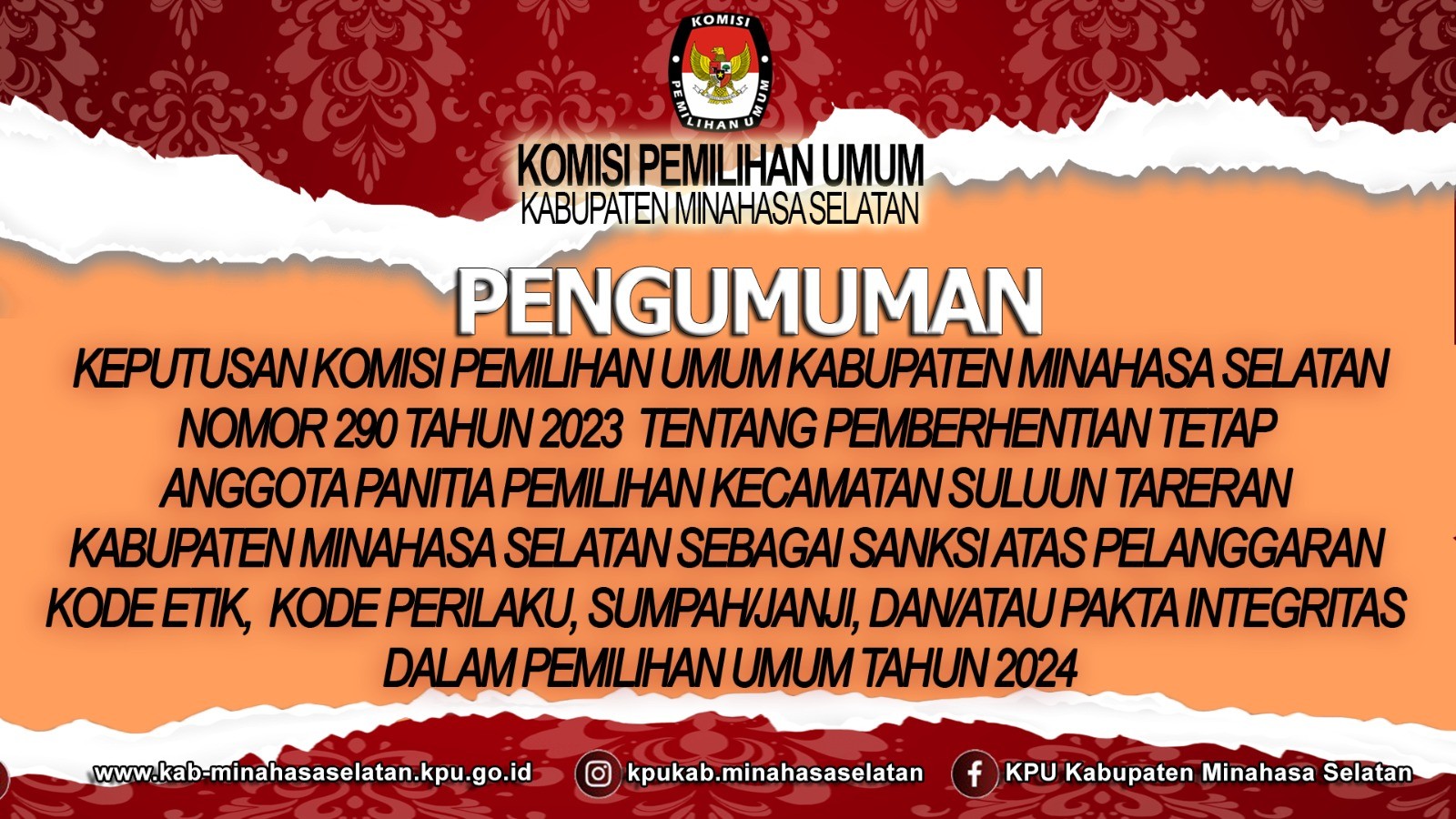 KEPUTUSAN KOMISI PEMILIHAN UMUM KABUPATEN MINAHASA SELATAN TENTANG PEMBERHENTIAN TETAP ANGGOTA PANITIA PEMILIHAN KECAMATAN SULUUN TARERAN KABUPATEN MINAHASA SELATAN SEBAGAI SANKSI ATAS PELANGGARAN KODE ETIK, KODE PERILAKU, SUMPAH/JANJI, DAN/ATAU PAKTA INTEGRITAS DALAM PEMILIHAN UMUM TAHUN 2024